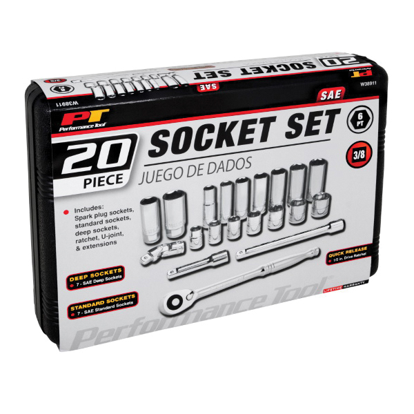 Performance Tool™ W38911 Socket Set, Imperial, 6 Points, 3/8 in Drive, 20 Pieces, Included Socket Size: 3/8 to 3/4 in Standard, 3/8 to 3/4 in Deep, 5/8 to 13/16 in Spark Plug