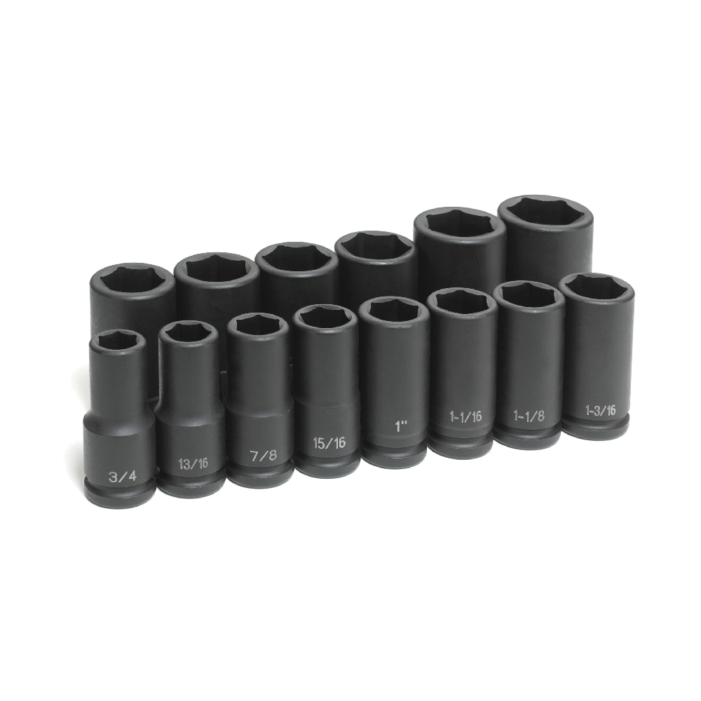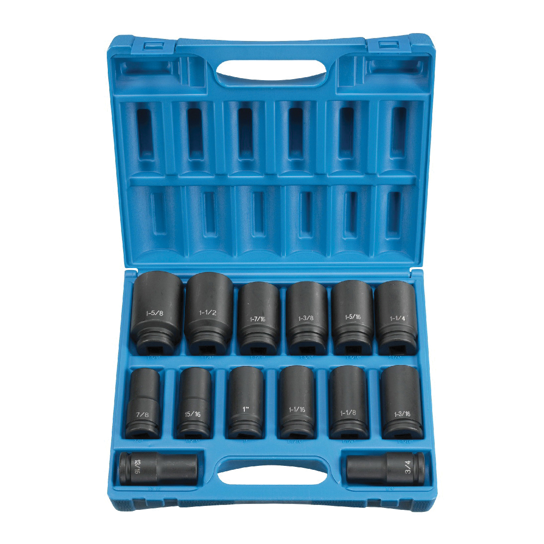 Includes3024D 3/4 in, 3026D 13/16 in, 3028D 7/8 in, 3030D 15/16 in, 3032D 1 in, 3034D 1-1/16 in, 3036D 1-1/8 in, 3038D 1-3/16 in, 3040D 1-1/4 in, 3042D 1-5/16 in, 3044D 1-3/8 in, 3046D 1-7/16 in, 3048D 1-1/2 in, 3052D 1-5/8 in Impact Socket and Molded Storage Case