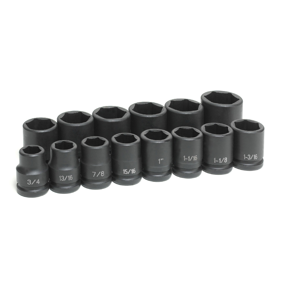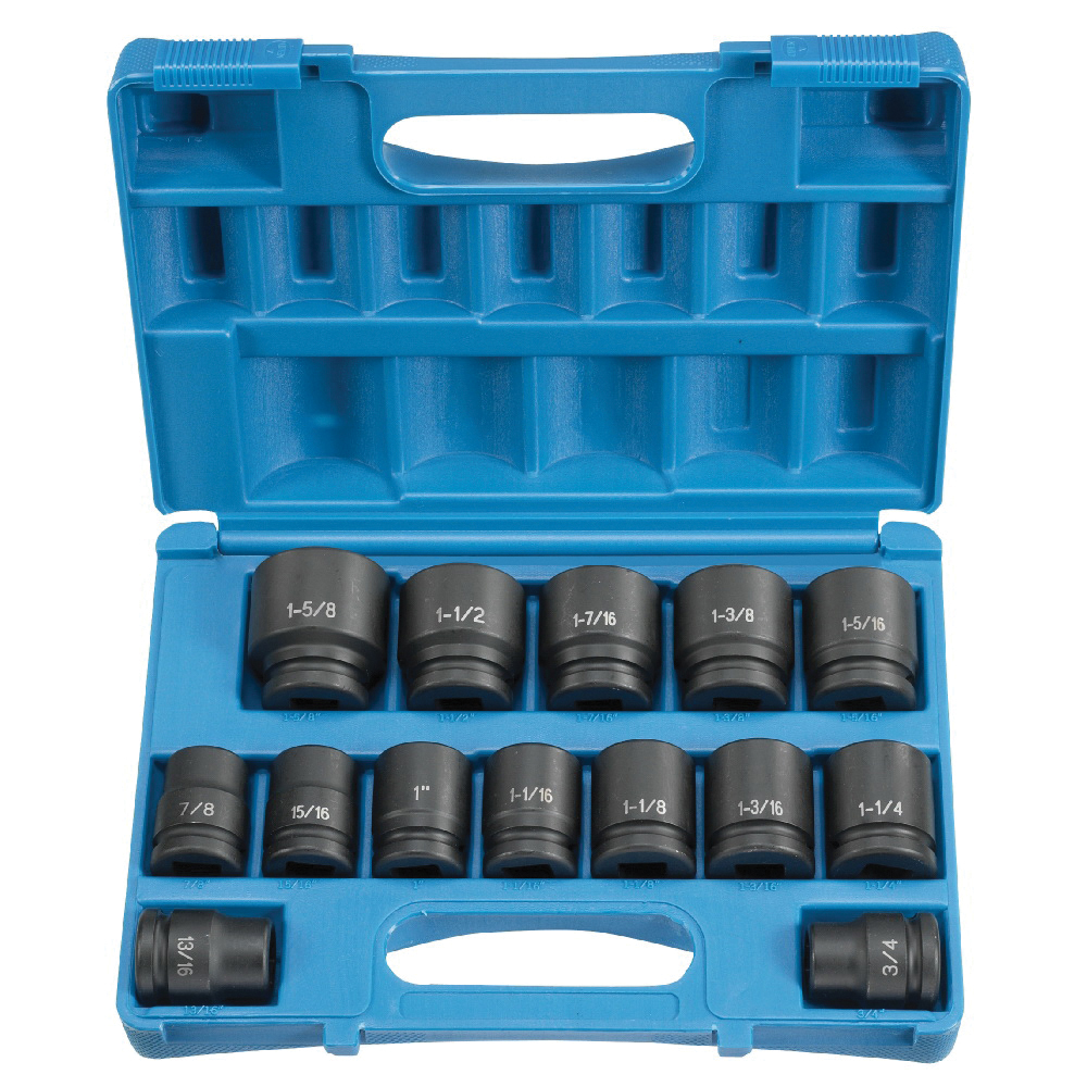 Includes3024R 3/4 in, 3026R 13/16 in, 3028R 7/8 in, 3030R 15/16 in, 3032R 1 in, 3034R 1-1/16 in, 3036R 1-1/8 in, 3038R 1-3/16 in, 3040R 1-1/4 in, 3042R 1-5/16 in, 3044R 1-3/8 in, 3046R 1-7/16 in, 3048R 1-1/2 in, 3052R 1-5/8 in Impact Socket and Molded Storage Case
