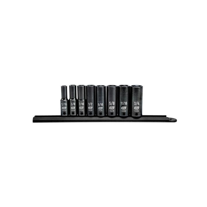 Includes84327N 5/8 in, 84322N 5/16 in, 84323N 3/8 in, 84324N 7/16 in, 84325N 1/2 in, 84326N 9/16 in, 84328N 11/16 in, 84329N 3/4 in 6-Point 3/8 in Drive Deep Length Impact SAE Sockets and Plastic Socket Rail