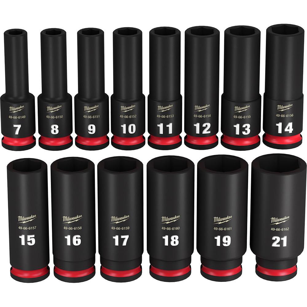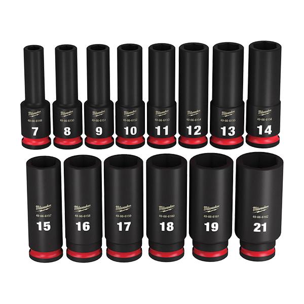 Milwaukee® SHOCKWAVE™ Impact Duty™ 49-66-7008 Deep Socket Set, ASME Specified, 6 Points, 3/8 in Drive, 14 Pieces, Hex, Included Socket Size: 7 mm, 8 mm, 9 mm, 10 mm, 11 mm, 12 mm, 13 mm, 14 mm, 15 mm, 16 mm, 17 mm, 18 mm, 19 mm and 21 mm, Case Container