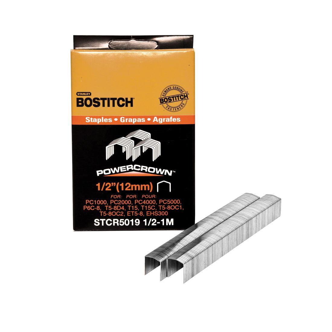 Stanley BOSTITCH STCR50191/2-1M 1, 000-qty. 1/4" Leg .050" X .019" Heavy duty 7/16" Power crown Staple (5 pack)Stanley- manufactures top-quality, innovative fastening tools and fasteners for industrial, construction and home improvement applications. Products include pneumatic staplers and mailers, compressors, manually operated staplers and tackers, coil-fed screw systems, rivet tools, glue guns, a broad assortment of collated nails, screws, staples and specialty fasteners in a variety of materials and finishes, plus office products and carton-closing staplers - many of them industry firsts. Stanley BOSTITCH STCR50191/2-1M 1, 000-qty. 1/4" Leg .050" X .019" Heavy duty 7/16" Power crown Staple (5 pack) features:; 1, 000 per card; STCR50191/4-1m: 1/4"; STCR50193/8-1m: 3/8"; STCR50191/2-1M: 1/2"; STCR50199/16-1m: 9/Stanley BOSTITCH STCR50191/2-1M 1, 000-qty. 1/4" Leg .050" X .019" Heavy duty 7/16" Power crown Staple (5 pack) Specifications:; fastener crown length: 7/16"; fits BOSTITCH tools: PC1000, PC2000, PC4000, pc4000-oc1, PC5000, H30-8, p6c-8, uso56-1; leg length: 1/2"; quantity per item pack: 1, 000; staple wire gauge: .050" X .019"