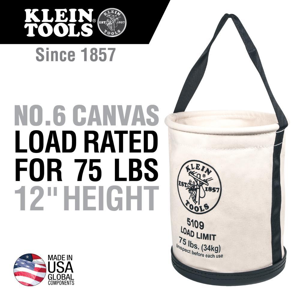 The heavy-duty Klein Tools Wide-Opening Straight-Wall Tool Bucket is designed for durability and utility. Made from heavy-duty No. 6 Canvas with a black molded polypropylene bottom, it can handle up to a 75-pound load. The web handle extends down the sides of the bucket for added strength.