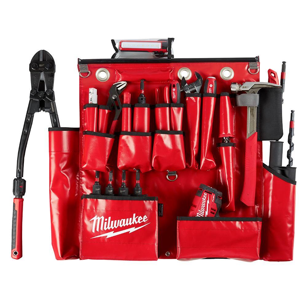 The MILWAUKEE® Lineman's Aerial Tool Apron provides easy organization and lasting durability. The aerial tool board is designed specifically for linemen and power utility trades. It features a multi-sized auger holder that won't burn through after extended jobsite use. The Milwaukee tool apron has 25 custom pockets, including a dedicated flood light pocket, puncture-resistant knife pockets, and magnets to hold sockets in place. This electrician tool apron is constructed with durable vinyl material and features 3 nickel-plated brass eyelets. Built-in weep holes allow for water drainage in the pockets, and three included D-rings provide additional storage options. The aerial tool apron is designed for ultimate durability, giving a complete and durable storage system specifically designed for the utility trades.