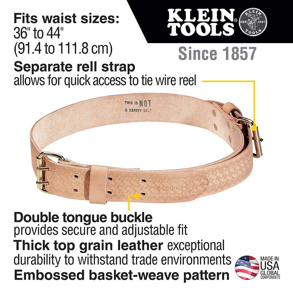 From Klein Tools, the Ironworker's Heavy-Duty Tie-Wire Belt has a separate reel strap with its own buckle that enables you to quickly and conveniently put on or remove a Klein Tie-Wire reel without removing the belt or tool pouch. The heavy tool belt is embossed with a basket weave pattern. The natural leather belt fits waist sizes up to 44-Inch.