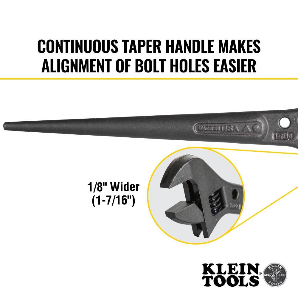 There is no need to carry several fixed-size wrenches when you have a Klein Tools' Adjustable-Head Construction Wrench. The extra-wide jaw fits nuts and bolts up to 1-7/16-Inch. Made in the USA and forged from durable, select alloy steel. The continuous-taper handle helps align bolt and rivet holes.