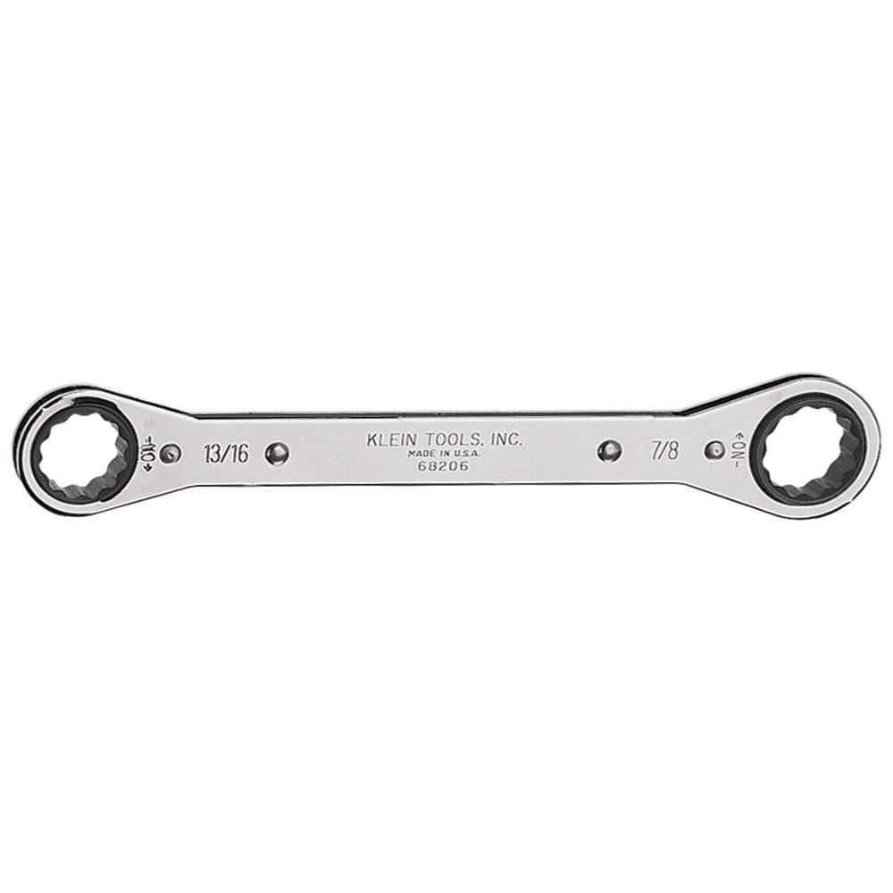The Klein Tools Ratcheting Box Wrench is great for working in confined spaces and on long studs. This wrench has a different size opening on each end for multiple applications. Get reverse ratcheting action simply by turning the wrench over.