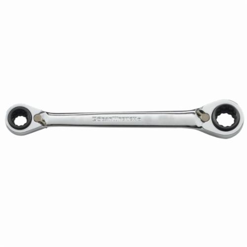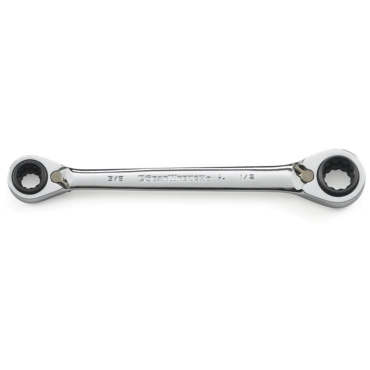 The GEARWRENCH QuadBox™ double box ratcheting wrenches give you 4 sizes on 1 wrench, reducing your tool count and making more space in your tool box. Each box end has two usable sizes, one on either side, and levers on either end to swap the wrench's ratcheting direction without removing the wrench. The ratcheting box end is designed to need as little as 5° of swing arc to move fasteners, versus 30° for standard wrenches. These wrenches are also made from a strong alloy steel with a bright, full polish chrome finish. Each ratcheting box end features an off-corner loading design for a better grip on the fastener and reduced fastener rounding. The 0° offset on both ends of the wrench provides greater access to fasteners in the tightest spaces.