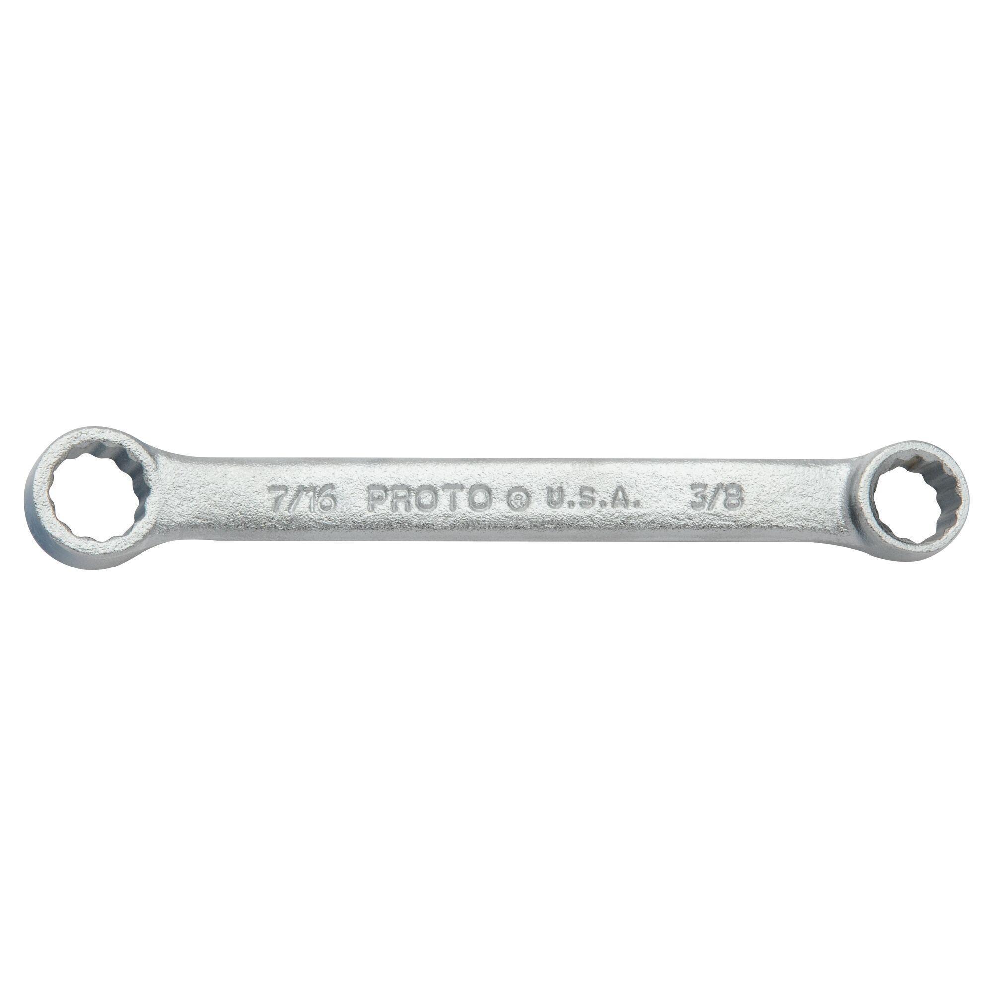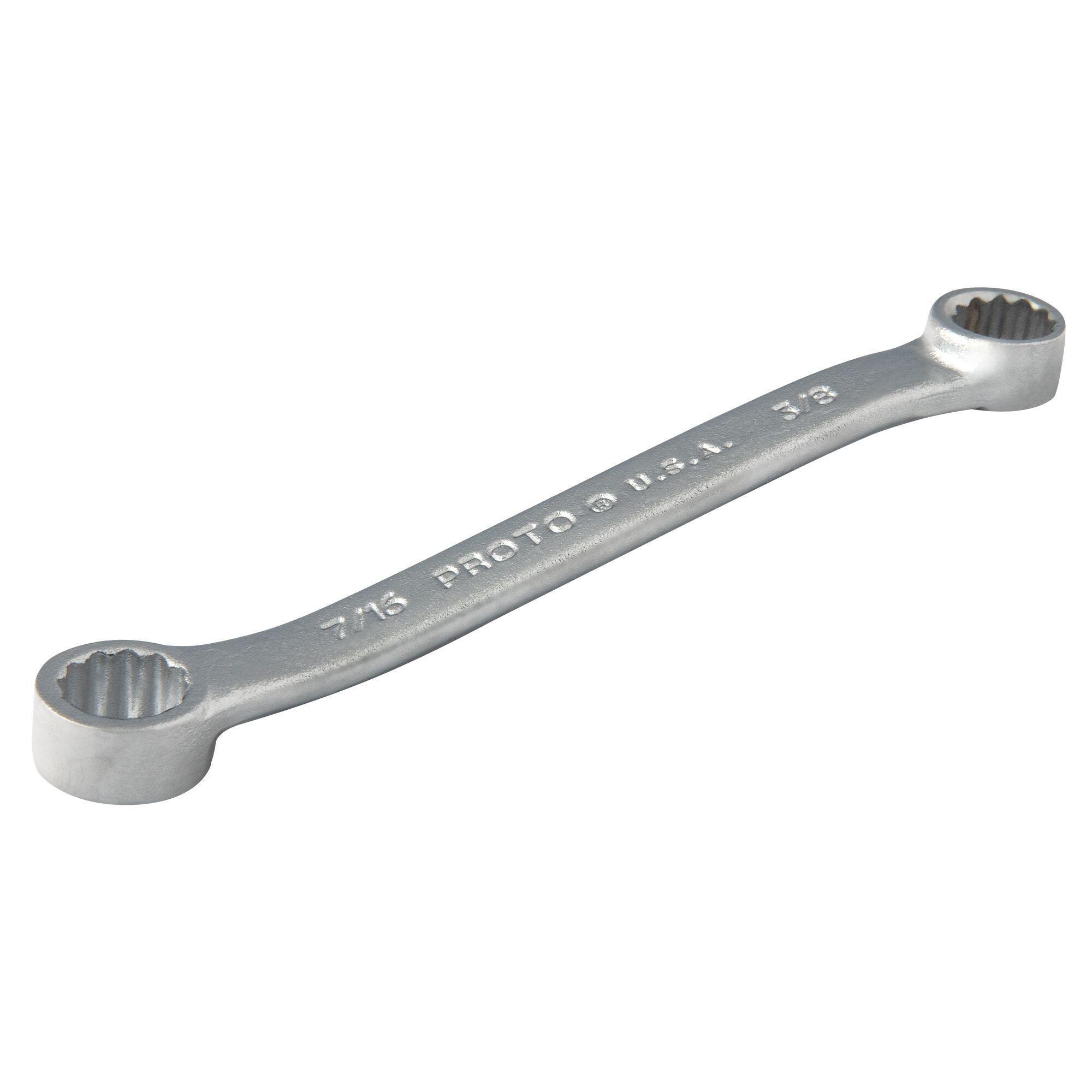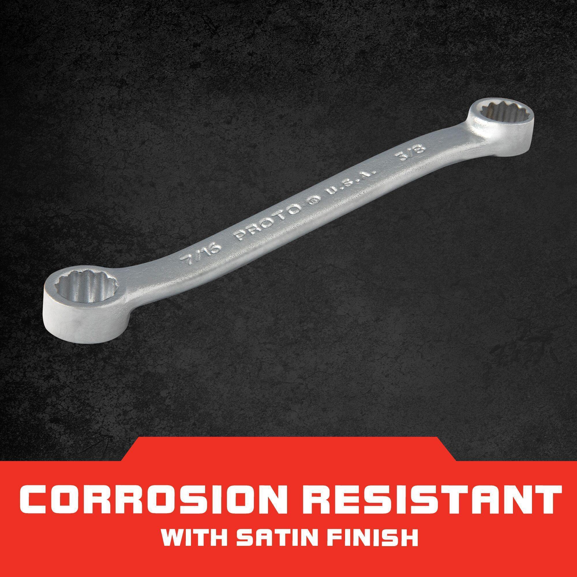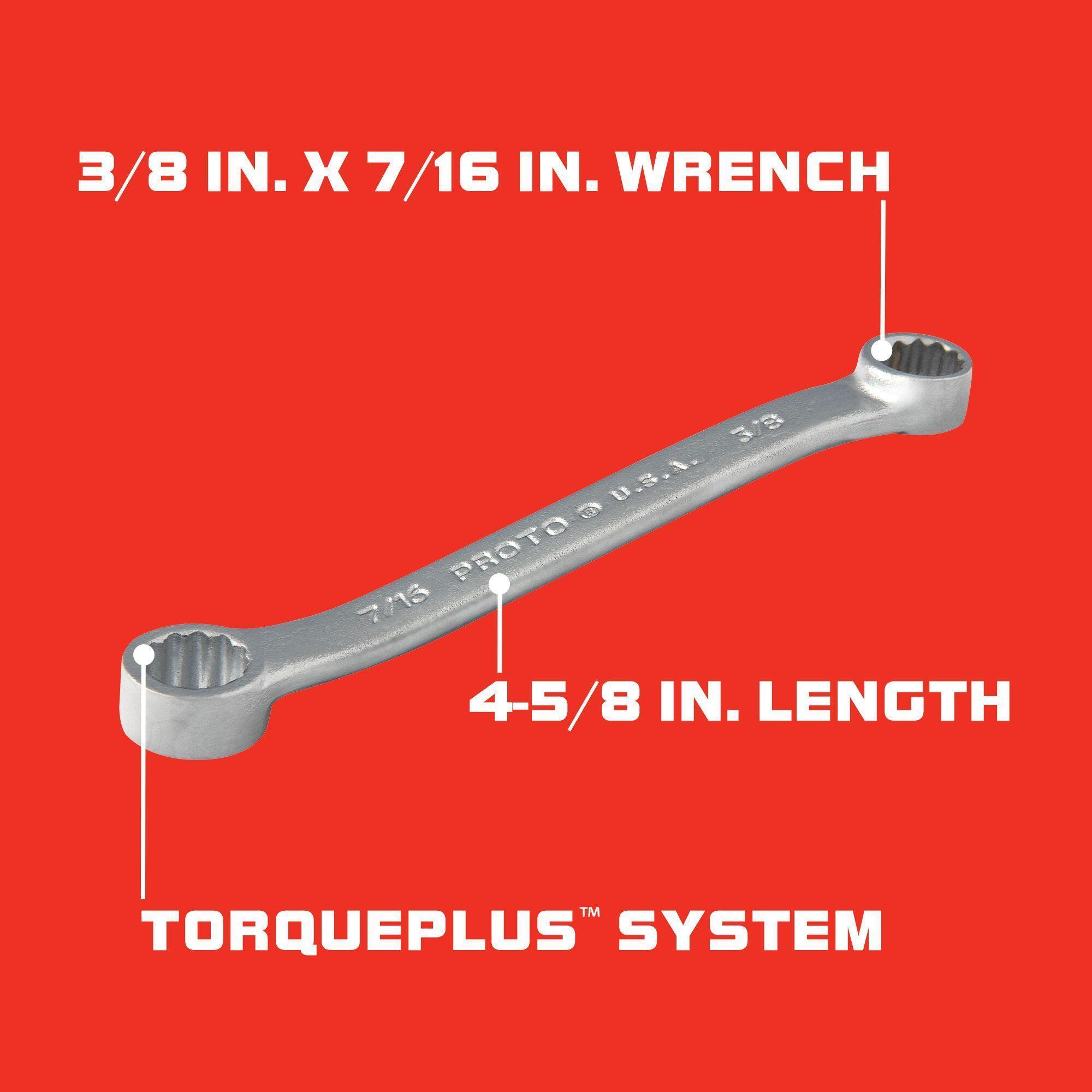 Proto® TorquePlus™ J1122 Box End Wrench, 3/8 x 7/16 in Wrench, 12 Points, 15 deg Offset, 4-5/8 in OAL, Alloy Steel, Satin, ASME B107.100, AS954E S3.8.1
