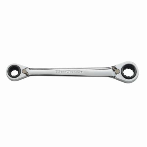 The GEARWRENCH® QuadBox™ double box ratcheting wrenches give you 4 sizes on 1 wrench, reducing your tool count and making more space in your tool box. Each box end has two usable sizes, one on either side, and levers on either end to swap the wrench's ratcheting direction without removing the wrench. The ratcheting box end is designed to need as little as 5 deg of swing arc to move fasteners, versus 30 deg for standard wrenches. These wrenches are also made from a strong alloy steel with a bright, full polish chrome finish. Each ratcheting box end features an off-corner loading design for a better grip on the fastener and reduced fastener rounding. The 0 deg offset on both ends of the wrench provides greater access to fasteners in the tightest spaces.