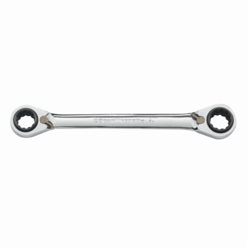 The GEARWRENCH QuadBox™ double box ratcheting wrenches give you 4 sizes on 1 wrench, reducing your tool count and making more space in your tool box. Each box end has two usable sizes, one on either side, and levers on either end to swap the wrench's ratcheting direction without removing the wrench. The ratcheting box end is designed to need as little as 5° of swing arc to move fasteners, versus 30° for standard wrenches. These wrenches are also made from a strong alloy steel with a bright, full polish chrome finish. Each ratcheting box end features an off-corner loading design for a better grip on the fastener and reduced fastener rounding. The 0° offset on both ends of the wrench provides greater access to fasteners in the tightest spaces.