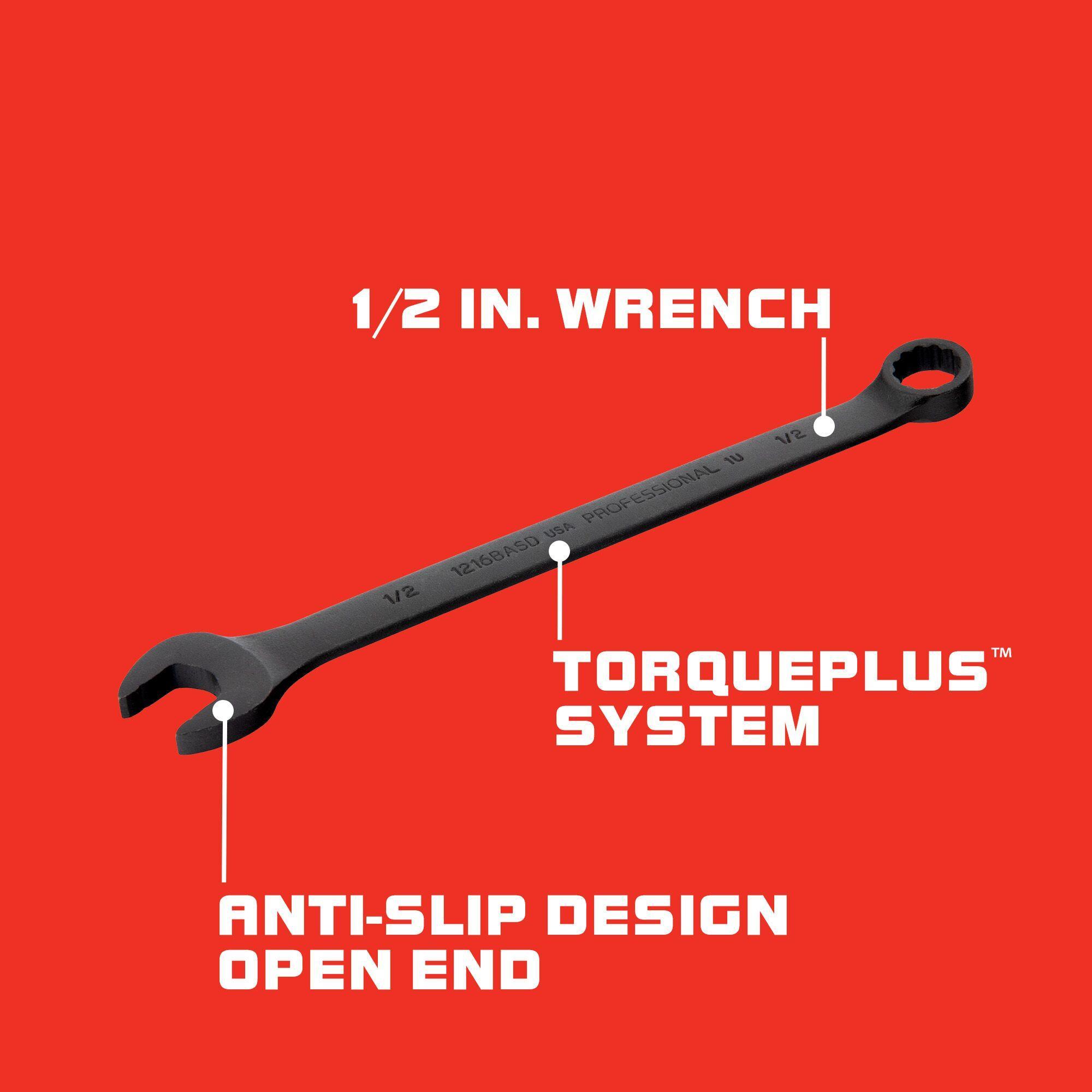 Proto® TorquePlus™ J1216BASD Anti-Slip Design Combination Wrench, Imperial, 1/2 in, 12 Points, 15 deg Offset, 8-7/8 in OAL, Alloy Steel, Black Oxide, ASME B107.100
