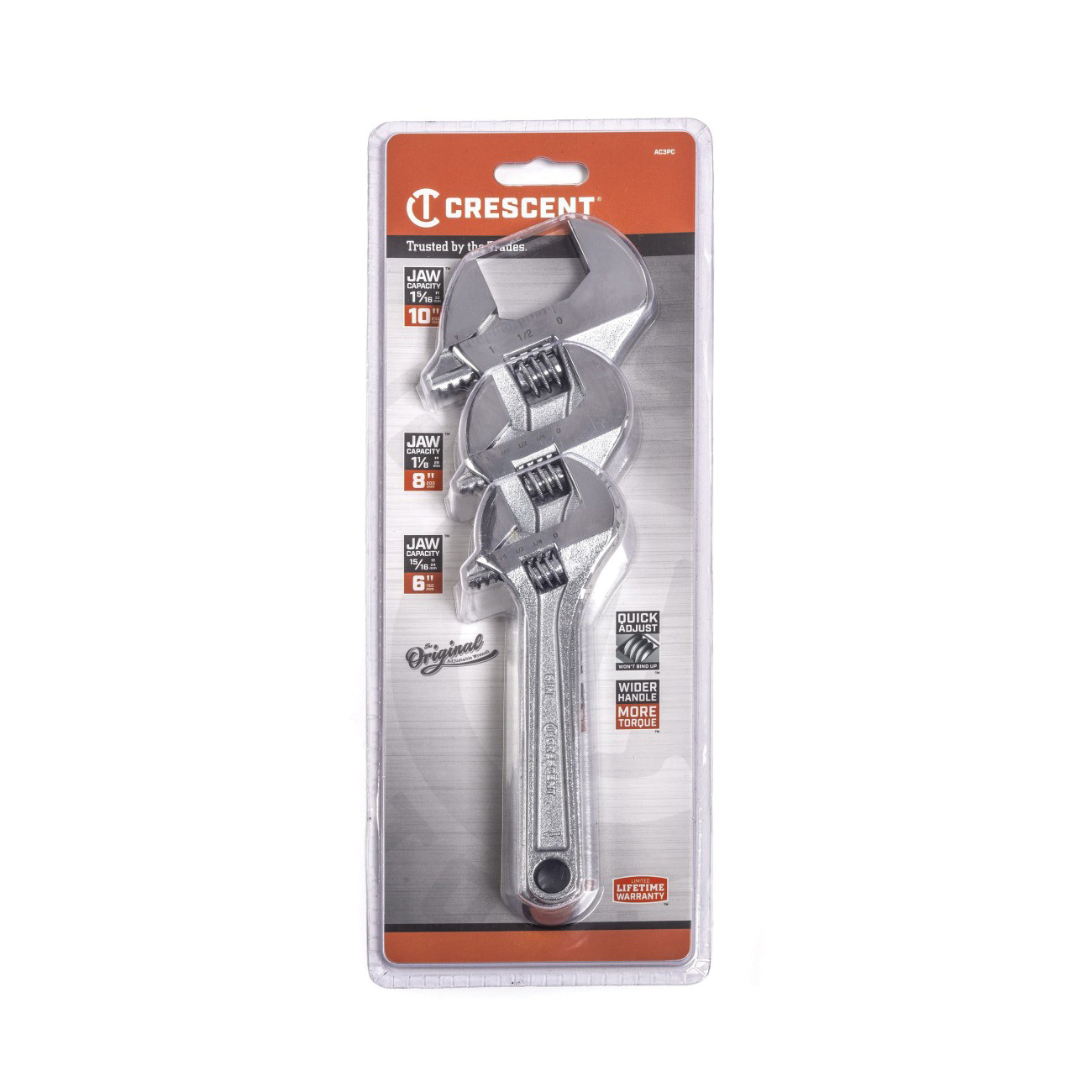 Includes6 in, 8 in and 10 in Adjustable Wrench