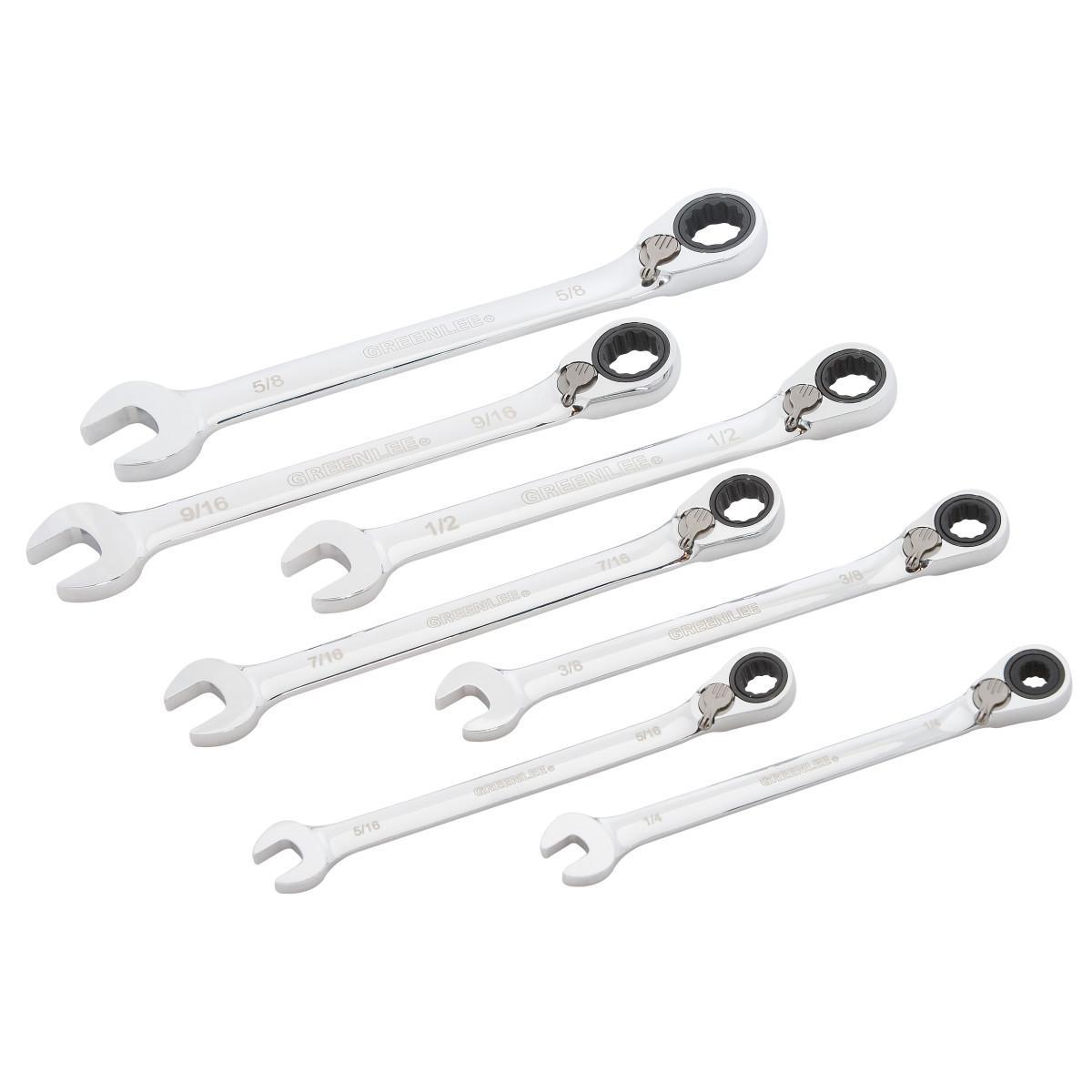 Greenlee® 0354-01 Combination Ratcheting Standard Wrench Set, 7 Pieces, 1/4 to 5/8 in, Polished Chrome