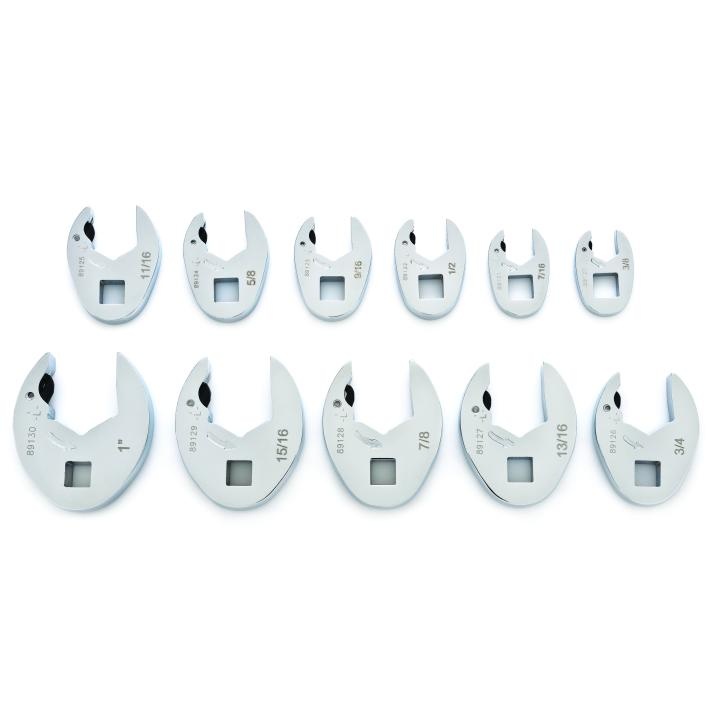 Includes89120 3/8 in, 89121 7/16 in, 89122 1/2 in, 89123 9/16 in, 89124 5/8 in, 89125 11/16 in, 89126 3/4 in, 89127 13/16 in, 89128 7/8 in, 89129 15/16 in and 89130 1 in Ratcheting Crowfoot Wrenches and Blow Molded Case