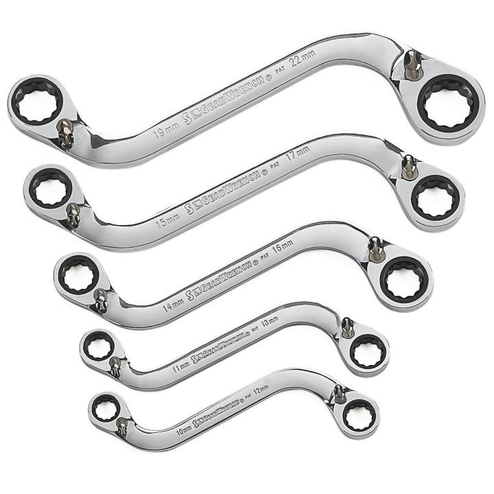 The GEARWRENCH s-shape double box ratcheting wrenches offer two ratcheting box ends on each wrench. The half moon design allows for access around obstructions. They are designed to need as little as 5° to move fasteners versus 30° for standard wrenches. The wrenches are made from a strong alloy steel with a bright, full polish chrome finish. They feature off-corner loading for a better grip on the fastener and reduces fastener rounding. The 0° offset on both ends of the wrench provides greater access to fasteners in the tightest spaces. The 85299 is a 5 piece metric set that includes 10 mm x 12 mm, 11 mm x 13 mm, 14 mm x 16 mm, 15 mm x 17 mm, and 19 mm x 22 mm sizes.