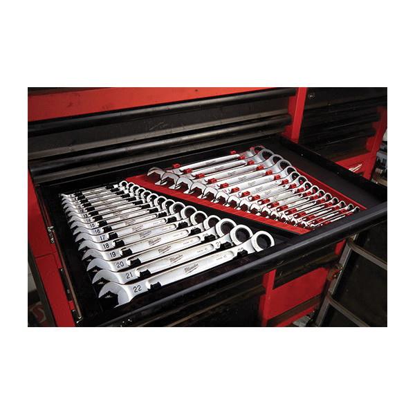 Milwaukee’s ratcheting combination wrenches offer an industry-leading 2.5° of arc swing, allowing our users to work quickly and efficiently even in the tightest of spaces. Our durable double-stacked pawls in the ratcheting mechanism offer longest ratchet life and best access with 144 ratcheting positions. The MAX BITE™ open-end grip improves the wrench's grip on nuts and bolts, offering 25% more torque than smooth-faced wrenches. The comfortable I-Beam handle design allows superior user comfort. Milwaukee wrenches feature ink-filled size labels for easy size identification, as well as quick distinction between SAE and metric sets. The 15 pc. sets come in trays designed for steel storage drawers, allowing for efficient storage with no wasted space. The 7 pc. kits come in a portable, locking storage tray, offering organization both on and off the jobsite. Standing behind our products, Milwaukee offers a lifetime guarantee on all of our ratcheting combination wrench sets.