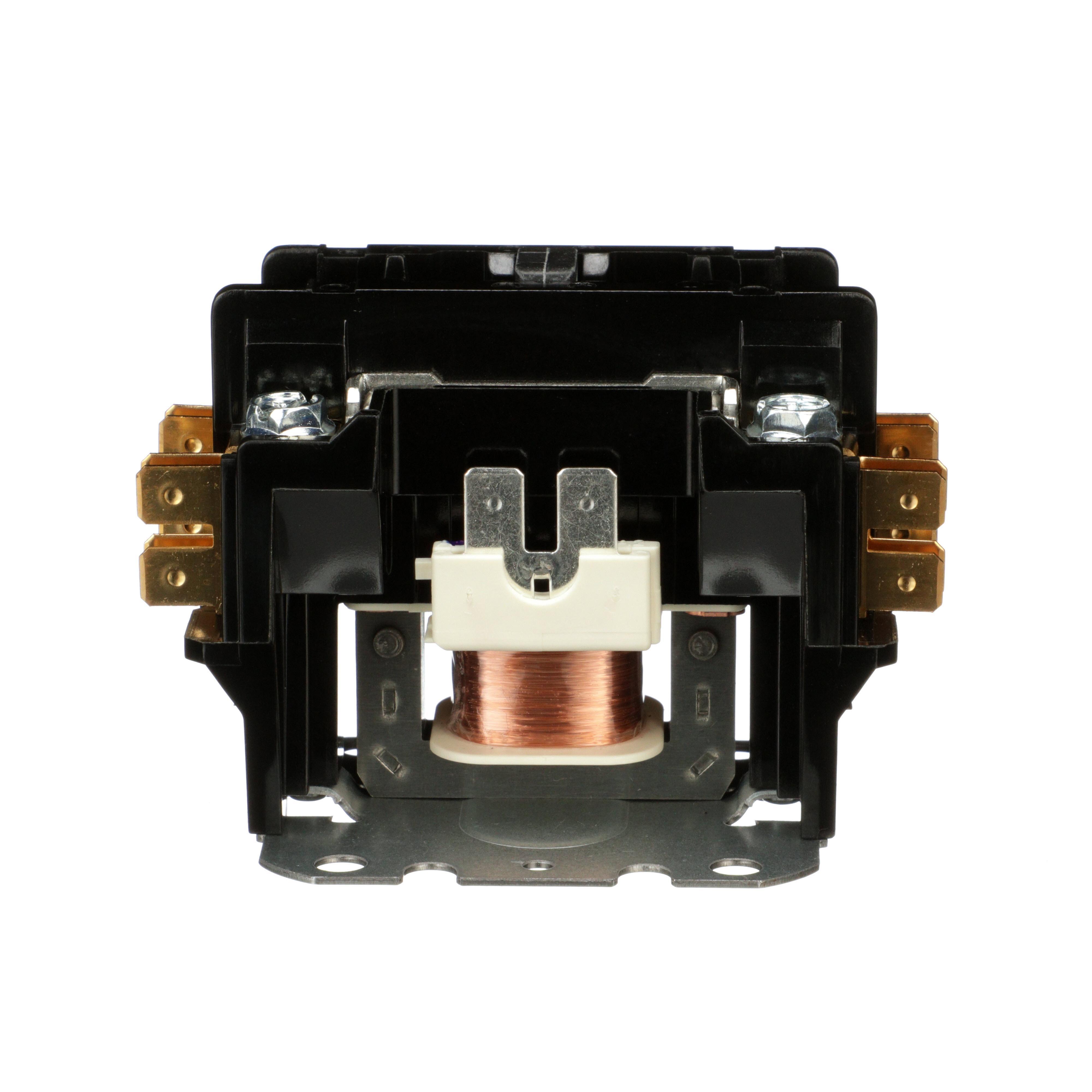8910DP definite purpose magnetic contactors are designed for heating, air conditioning and refrigeration applications. This line of definite purpose contactors has current ratings up to 120 amperes resistive and 50 HP at 600 VAC. This one pole definite purpose contactor has a full load rating of 30 ampere and a resistive rating of 40 amperes. The nonreplaceable coil is available with a variety of coil voltages. This device has a 110/120 VAC 50/60 Hz coil. The contactor has straight through wiring. Contactor is 2.00 inches by 3.29 inches and 2.39 tall. These contactors are UL Listed and CSA Certified.
