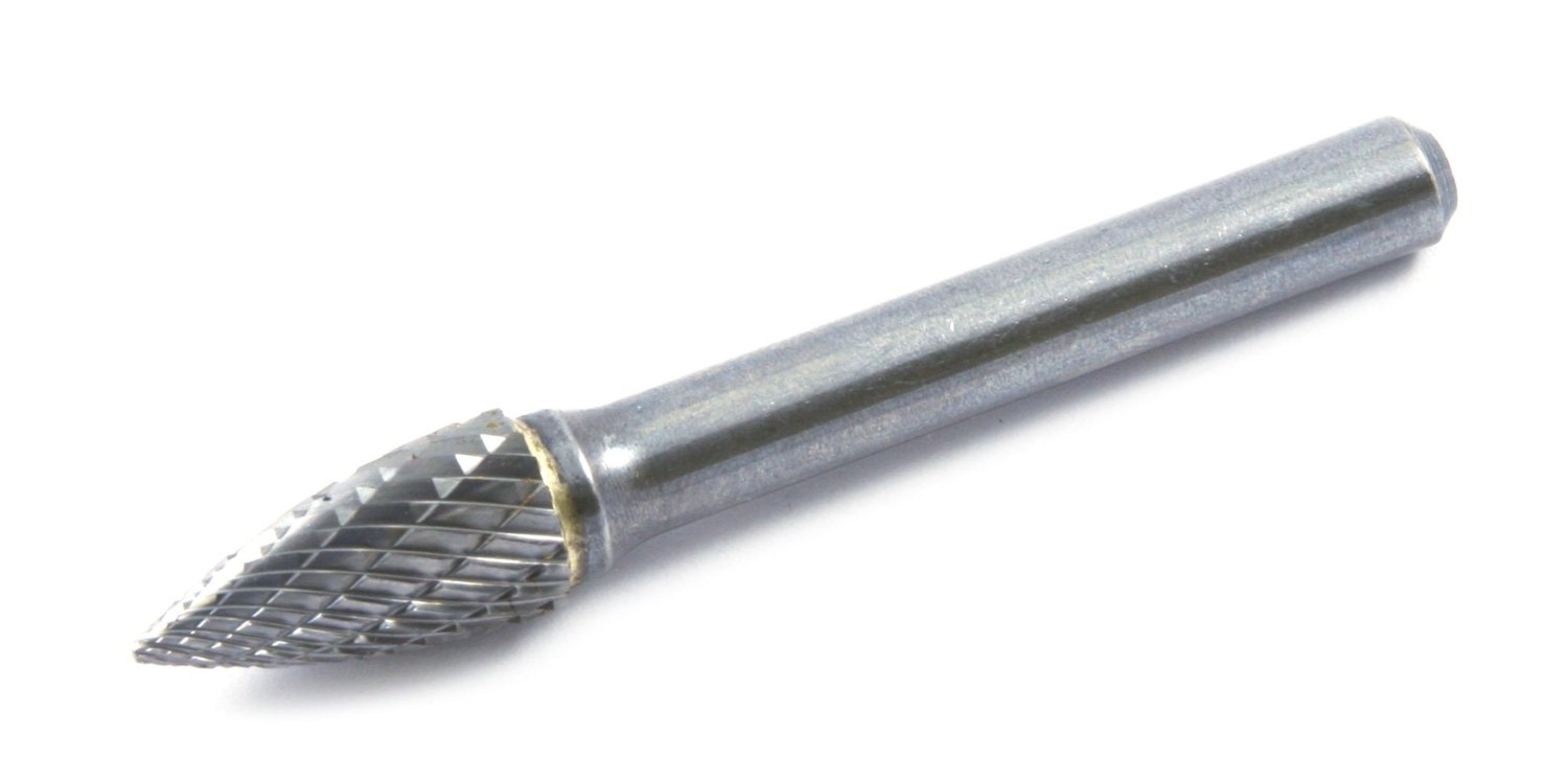 TUNGSTEN CARBIDE BURR, 3/8" TREE POINTED (SG-3) WITH 1/4" SHANK. MAX RPM: 70.000. SHANK MOUNTED TUNGSTEN CARBIDE BURRS ARE DOUBLE CUT FOR FINE WORK.-FOR60127 >