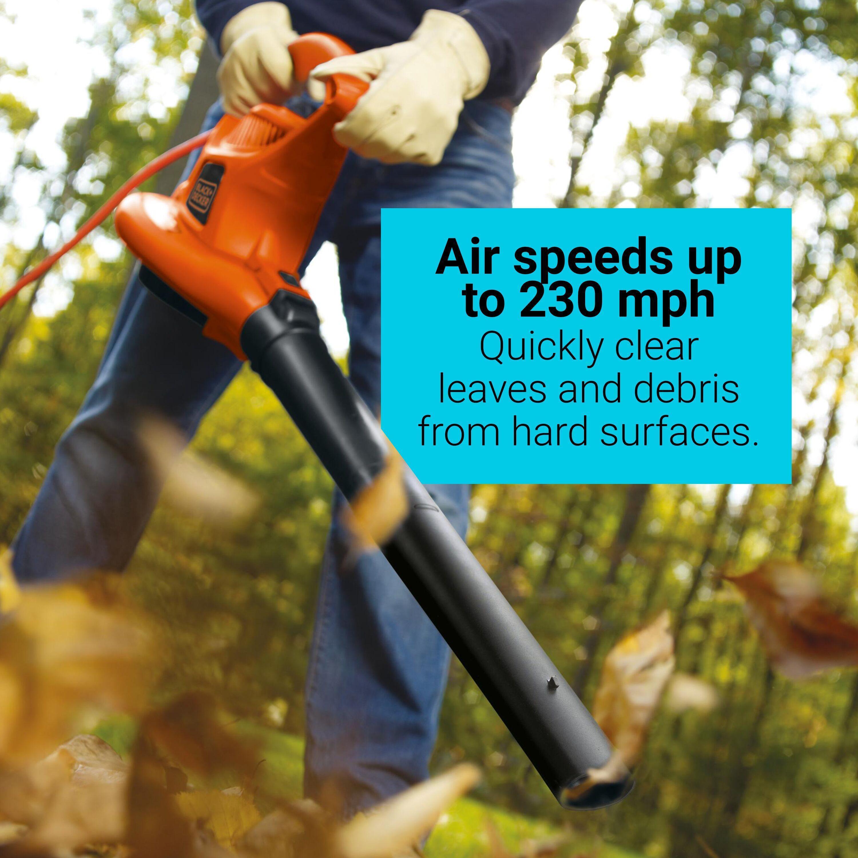 - Air speeds up to 230 mph deliver the power you need for quick, effective clearing on both grass and hard outdoor surfaces