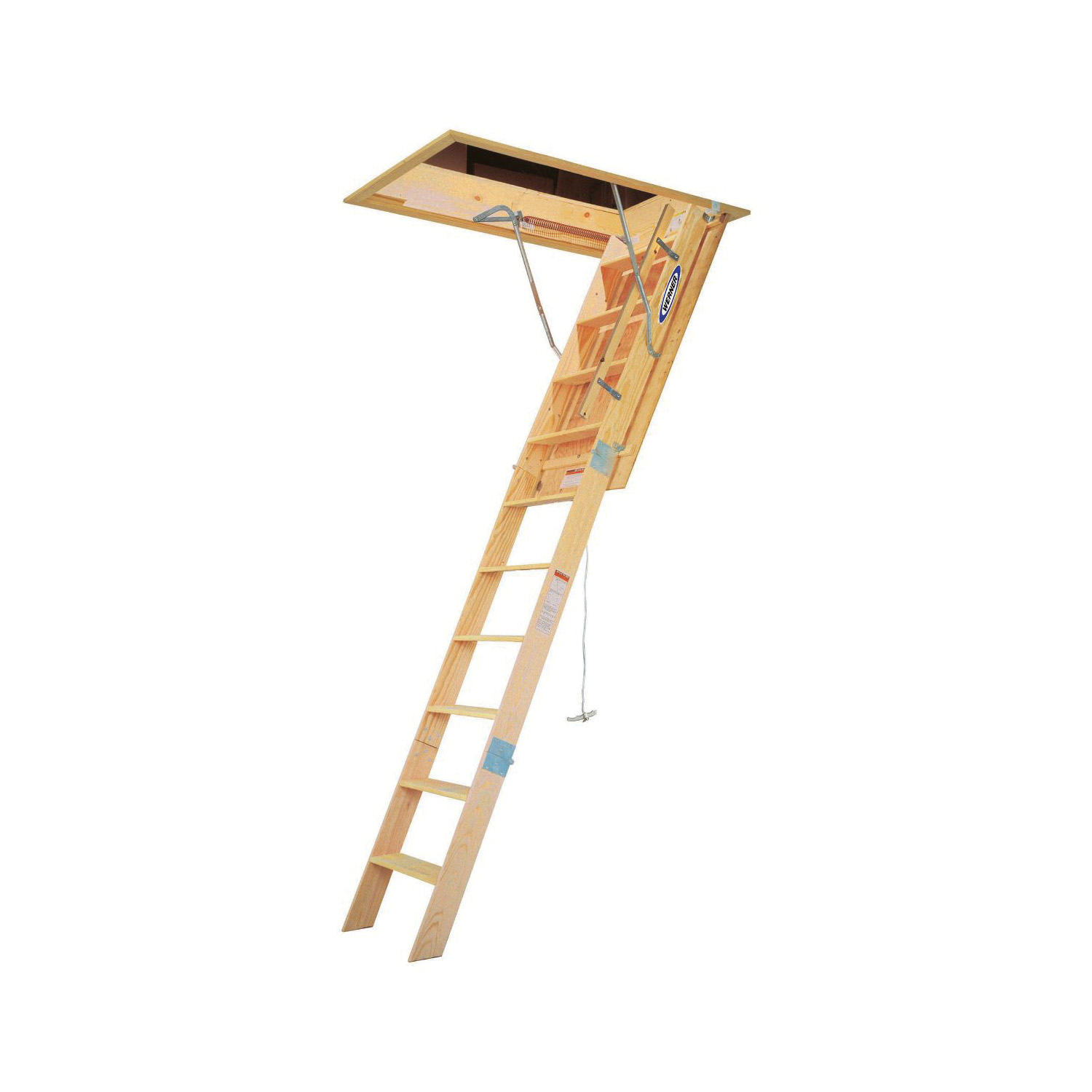 The WH2508 wood heavy duty attic ladder boasts a duty rating of 350 pounds. These ladders come fully assembled and ready to install. Full wrap around door hinge minimizes heat loss. High quality door can be painted or stained. Pull string allows for easy opening and closing. Hinges butt metal to metal to maintain ladder rigidity. Counter-balance mechanism eliminates sag and springiness.