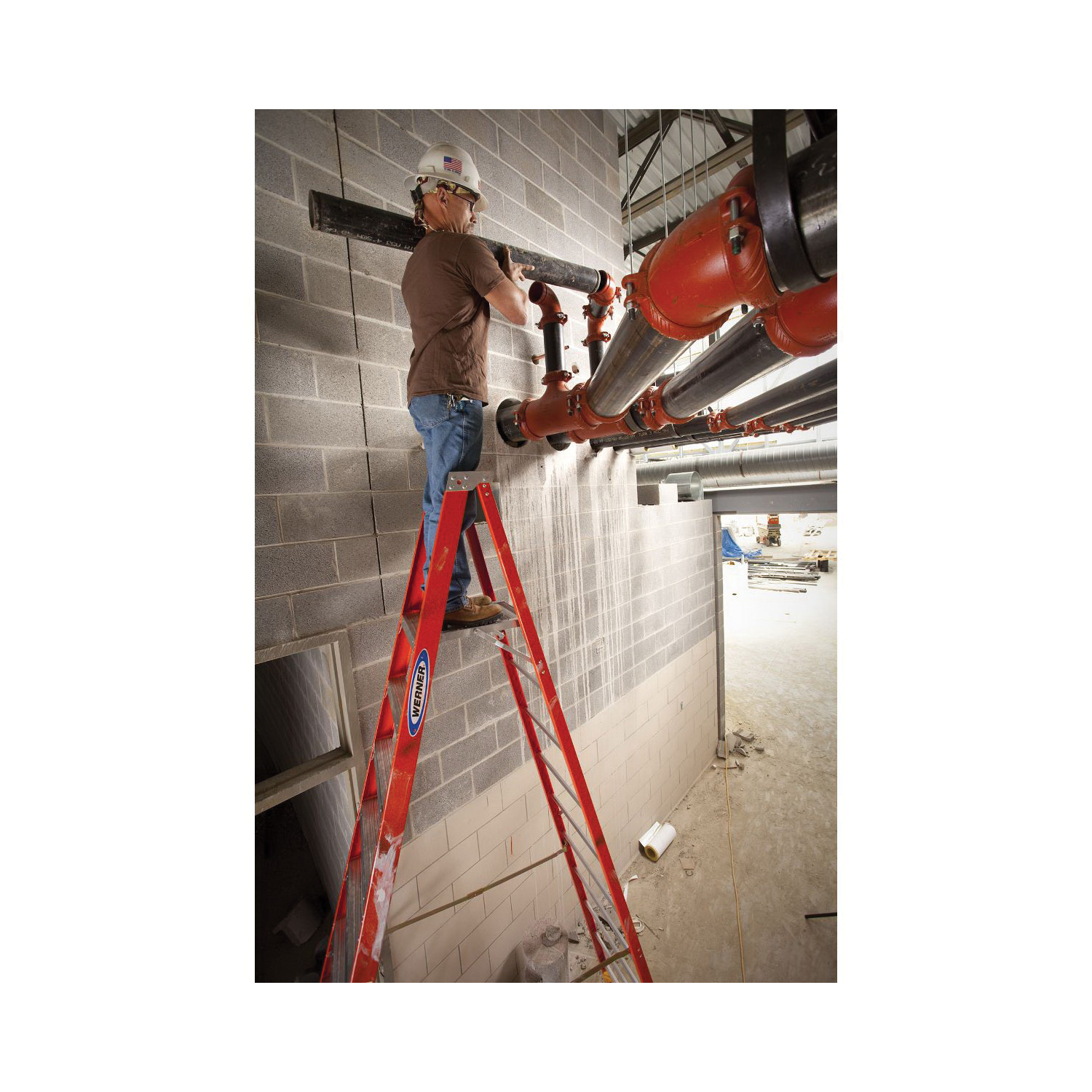 The P6208 fiberglass 8 ft platform ladder has a duty rating of 300 pounds and features a safety guard rail to encourage proper use. Back up plates reinforce all top connectors and the large platform provides a secure and comfortable work area. The slip resistant TRACTION-TRED® steps are double riveted and knee braced. A full set of rear horizontals are spaced one foot apart. The EDGE® molded brace and foot pad combination provides bracing strength and increased protection from damage. Fiberglass rails are non-conductive for working near electricity.