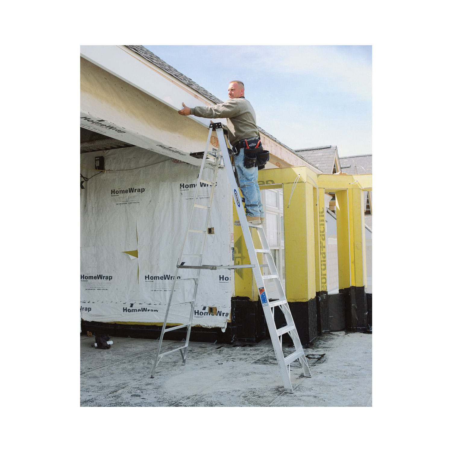The 310 aluminum 10 ft step ladder has a duty rating of 300 pounds yet is light weight and easy to transport. The Tool-Tra-Top® has a drill holster, convenient tray for tools/paint and small parts. There is also a sturdy molded paint can hanger on the backside of the top. The SPILL-PROOF® pail shelf has a rag rack and holds a gallon paint can and automatically closes with the ladder. There is a full set of horizontals on the rear section. The 4 ft, 5 ft and 6 ft models have a unique H spreader with hand grip for easy one handed carrying and closing. The TRACTION-TRED® steps are slip resistant and double riveted.