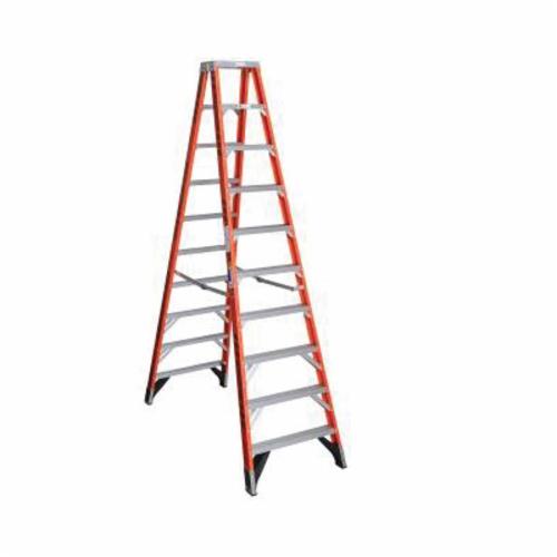 The T7410 Fiberglass 10 ft Twin Step Ladder features a duty rating of 375 pounds per side of the ladder. Designed for one or two-person jobs, the T7400 ladders have heavy gauge aluminum tops and feature heavy duty internal spreaders to resist damage around the worksite or in transit. The GLAS*MARK® Violater stripes on the rails make the ladder more visible and the Edge® bracing system and external rail shields add to the long lasting durability of these ladders. Fiberglass rails are non-conductive for working near electricity.