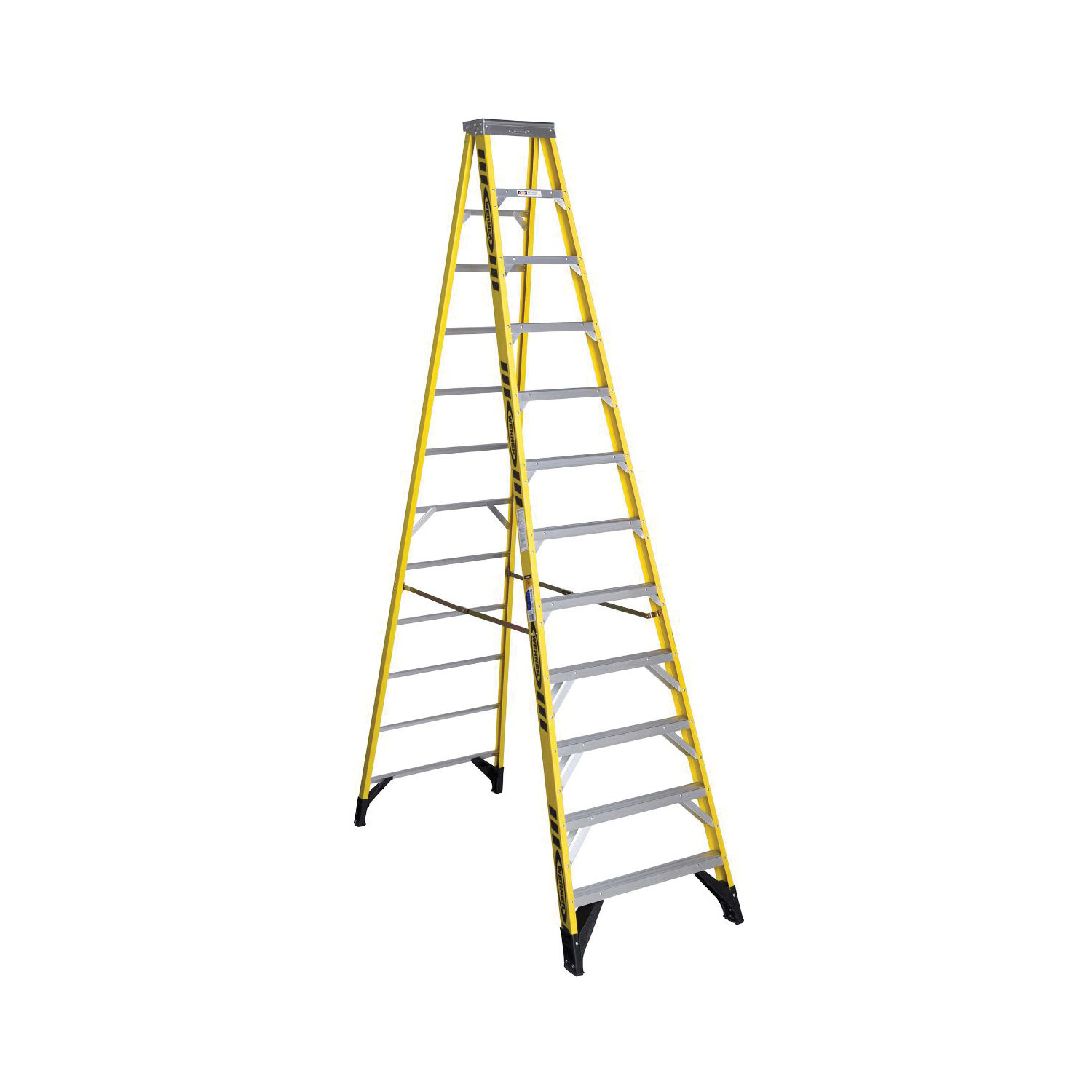 The 7312 fiberglass 12 ft step ladder has a duty rating of 375 pounds and features heavy duty aluminum HolsterTop. With a full set of horizontals and heavy duty internal spreaders, these ladders are built for the long haul. The molded external rail shields and the EDGE® bracing system help decrease damage to the rails. The slip resistant TRACTION-TRED® steps are single riveted and have extra wide knee braces. The Glas*Mark® violator stripes increase the visibility of the ladder on the jobsite. Fiberglass rails are non-conductive for working near electricity.