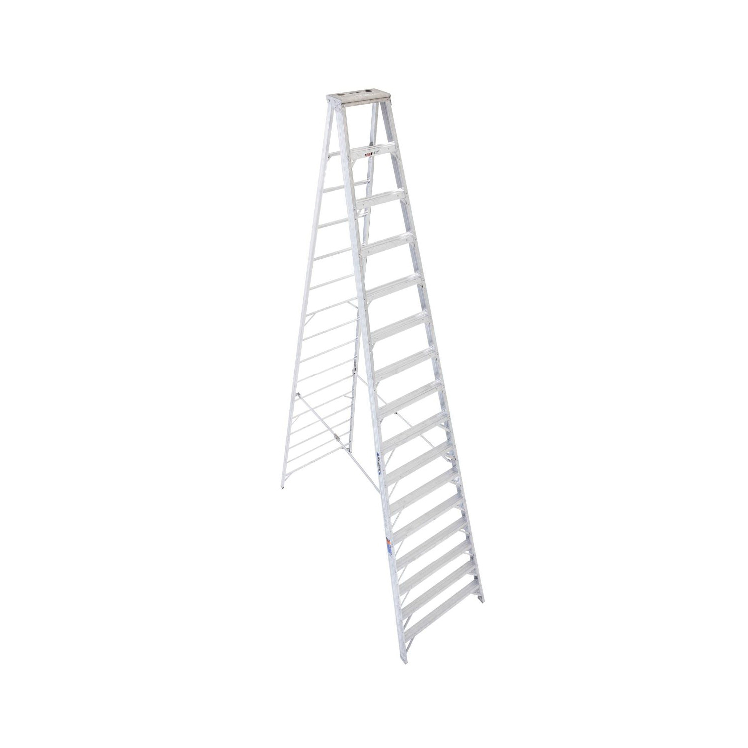 The 416 aluminum 16 ft step ladder has a duty rating of 300 pounds and features heavy gauge TOOL-TRA-TOP®. All steps are knee braced and the TRACTION-TRED® steps are slip resistant. The rear rail is a full U channel and a full set of rear horizontals are spaced one per foot.