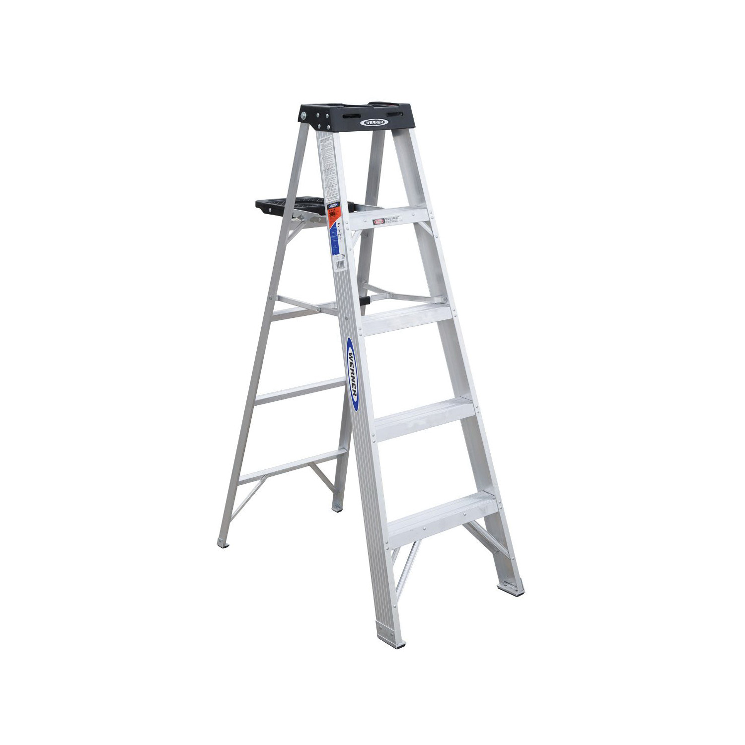 WERNER® 355 350 Type II Single Sided Step Ladder With Pail Shelf, 5 ft H Ladder, 225 lb Load, 4 Steps, Aluminum