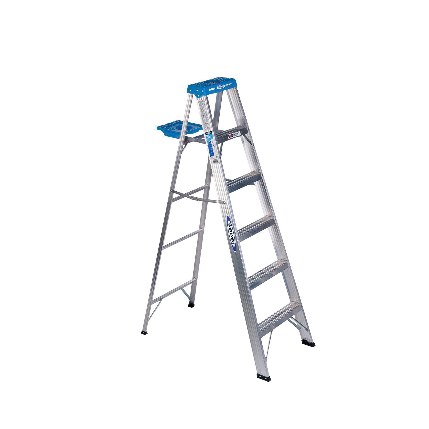 WERNER® 366 360 Type I Single Sided Step Ladder With Pail Shelf, 6 ft H Ladder, 250 lb Load, 5 Steps, Aluminum