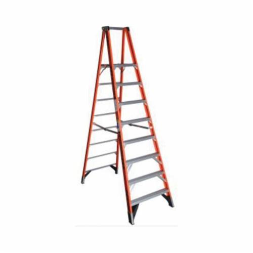 The P7408 Fiberglass 8 ft Platform Ladder has a rating of 375 pounds and maintains a full set of horizontals on the rear sections. The large work platform provides a secure and comfortable work area while the Edge® bracing system and external rails shields add to the durability of the product. The safety guard rail at the top of the ladder encourages proper ladder use. Fiberglass rails are non-conductive for working near electricity.
