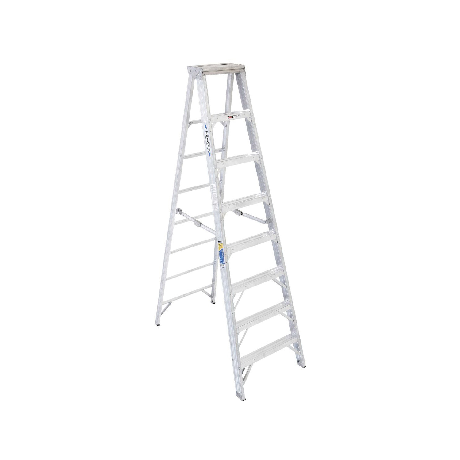 The 408 aluminum 8 ft step ladder has a duty rating of 375 pounds and features heavy gauge TOOL-TRA-TOP®. All steps are knee braced and the TRACTION-TRED® steps are slip resistant. The rear rail is a full U channel and a full set of rear horizontals are spaced one per foot. The 14 ft and 16 ft models carry a duty rating of 300 pounds.