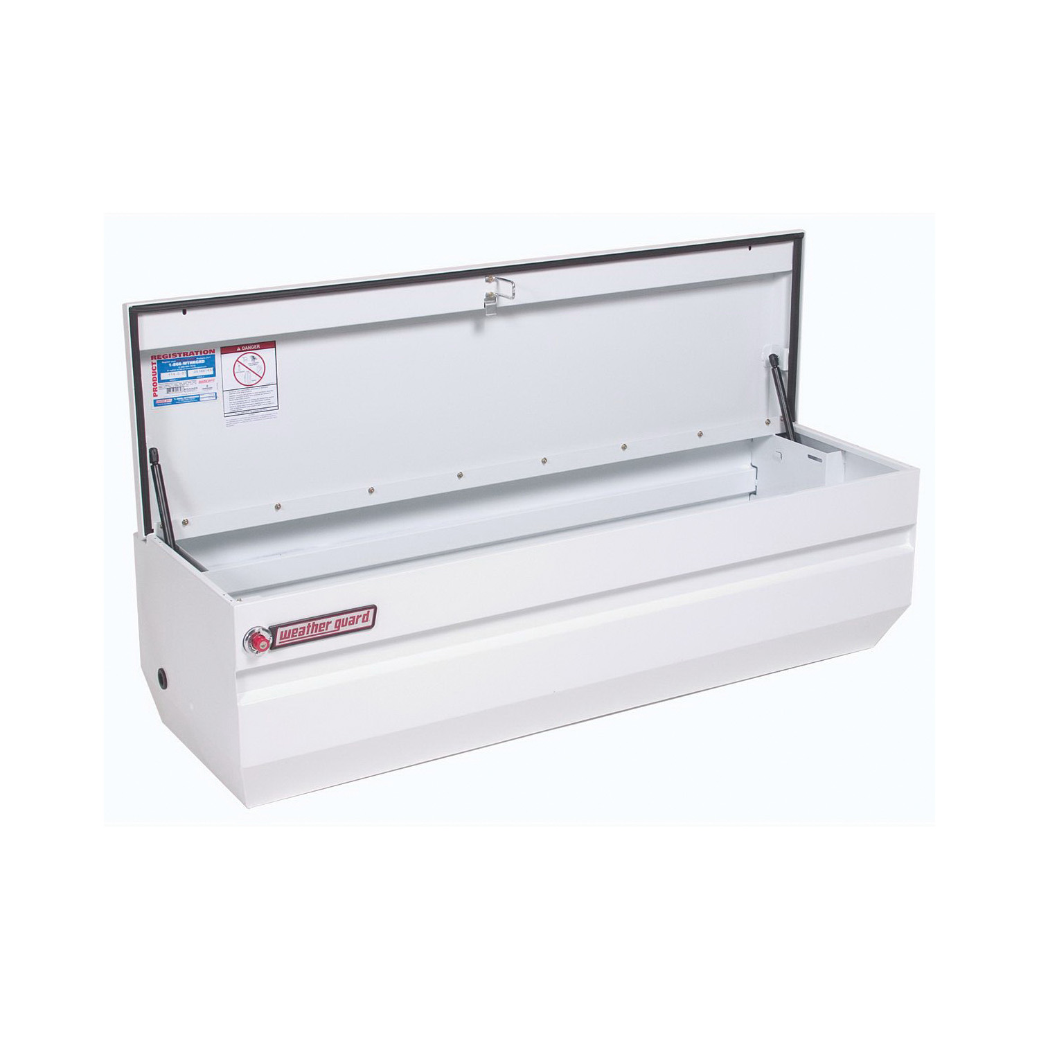Maximize your visibility. All-purpose chests sit below the bedrail accommodating tonneau covers and lids. The model 665-3-01 steel full size chest features a brite white Armor-Tuf® powder coat finish that ensures years of dependability and has a storage capacity of 13.1 cu ft. The cover opens to 90 degree for maximum access using a unique offset hinge design that still allows installation flush against the truck cab. The rotary-style latch mechanism keeps the cover tight against the weather seal and provides smooth one touch opening.
