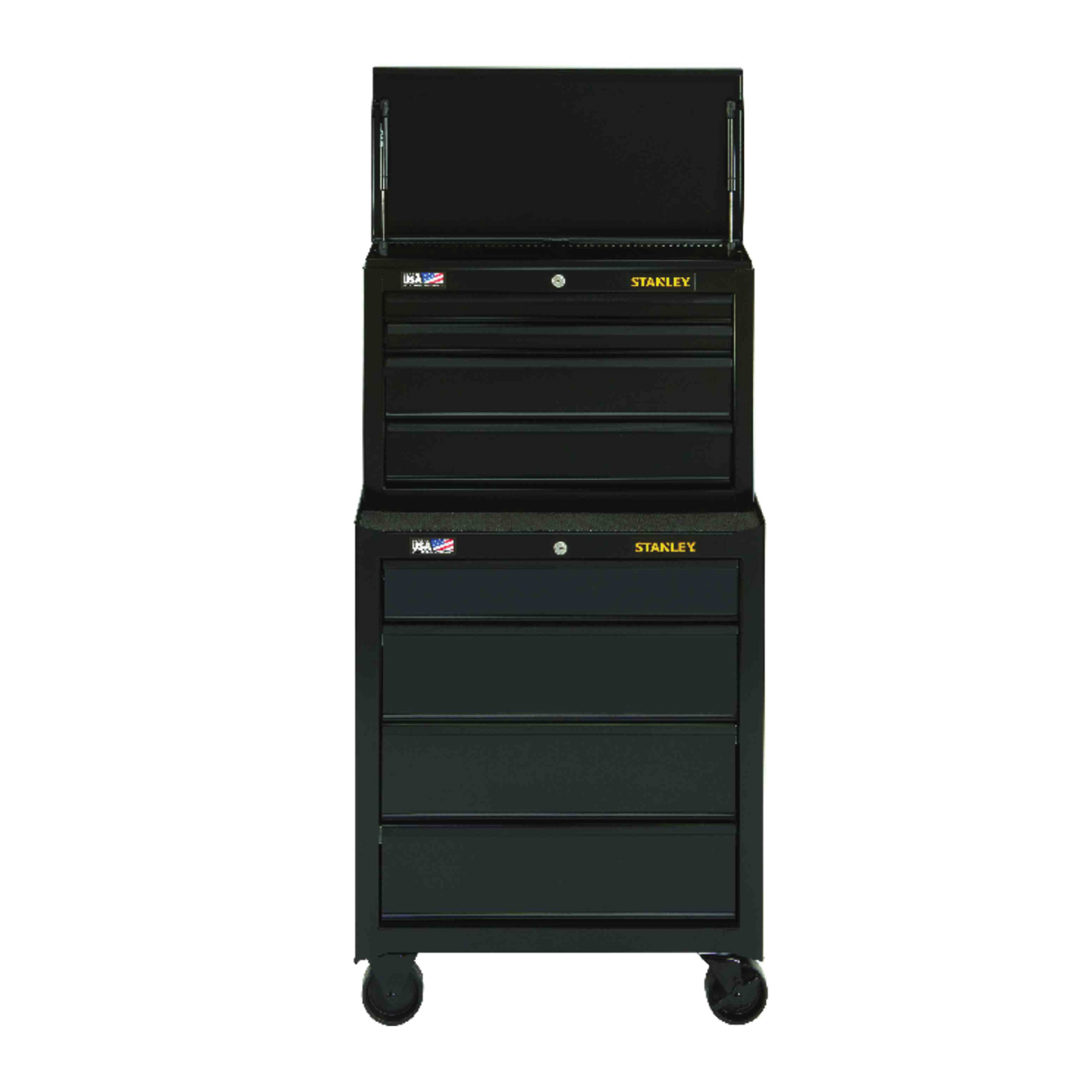 This 26-inch wide 4-Drawer Tool Chest is constructed of all-steel for strength and durability. It has four, 50-pound load capacity, full-extension ball-bearing drawer slides, and a keyed internal locking system to safeguard tools. Gas struts also provide easy lid opening and closing. Recommended with this unit is our 100 Series 26 in. W 2-Drawer Middle Chest (STST22621BK) and 100 Series 26 in. W 4-Drawer Rolling Cabinet (STST22742BK), sold separately. Look no further than our 100 Series Metal Tool Storage line for your home garage tool storage and organization needs. Choose from a variety of sizes in top and middle tool chests, rolling tool cabinets, and mobile workbenches, all made of 20-24 gauge steel with black steel drawer trims.