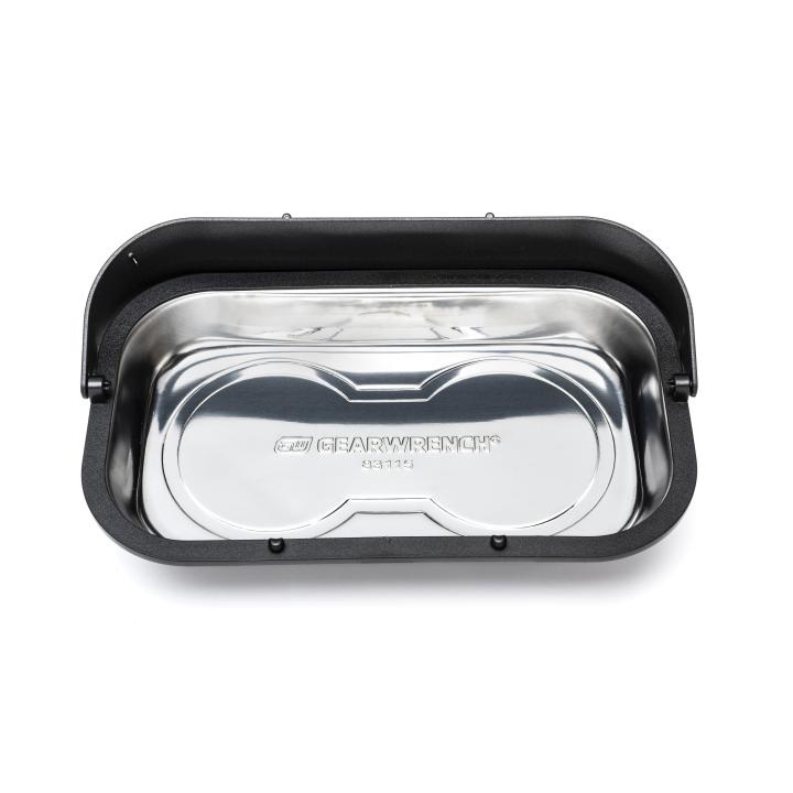 The magnetic parts trays from GEARWRENCH keep all of your small parts and pieces in one place while you work. The fully magnetized trays can be mounted vertically or horizontally to any ferrous metal surface, and the swiveling plastic rim keeps your non-magnetic items from falling out of the tray when hung vertically.