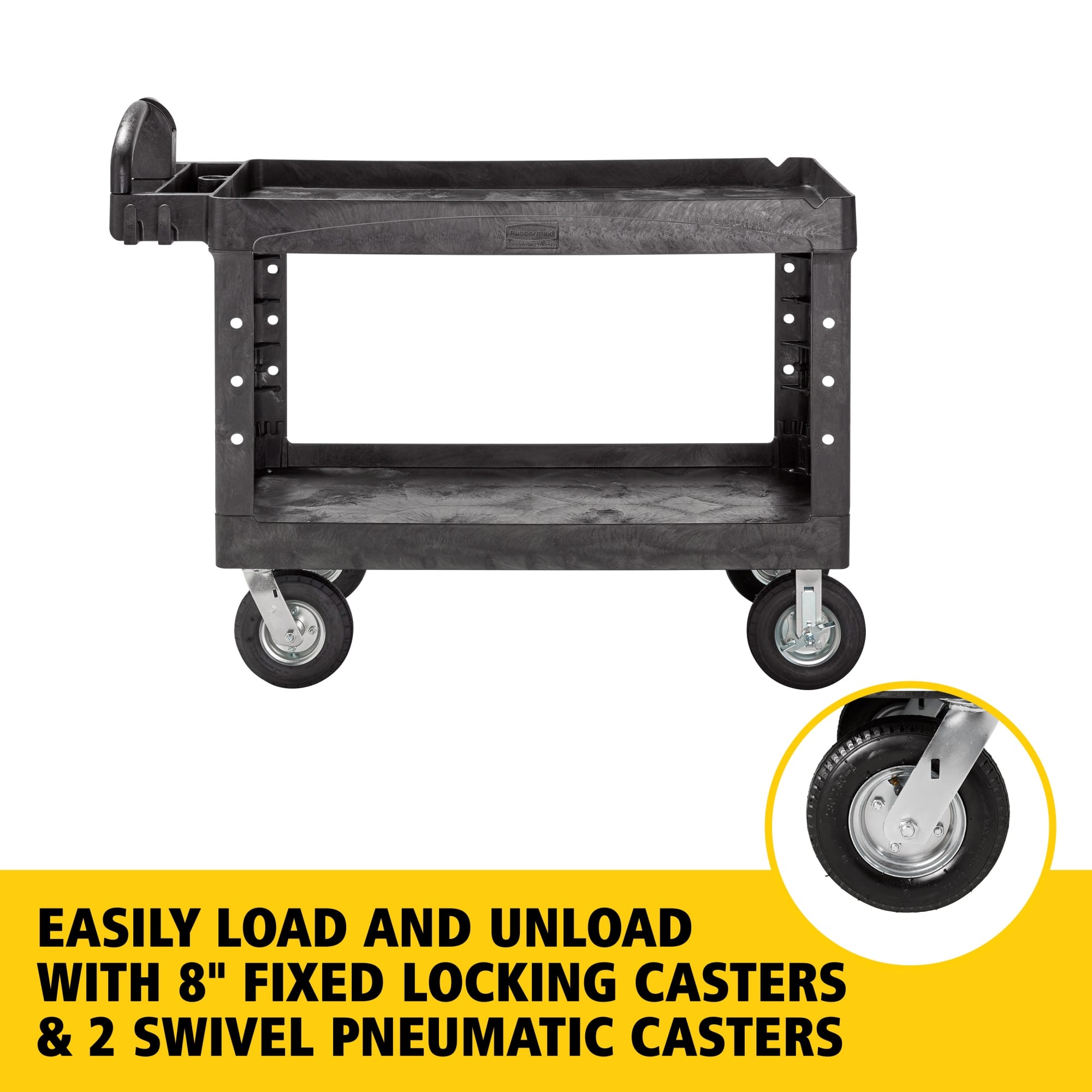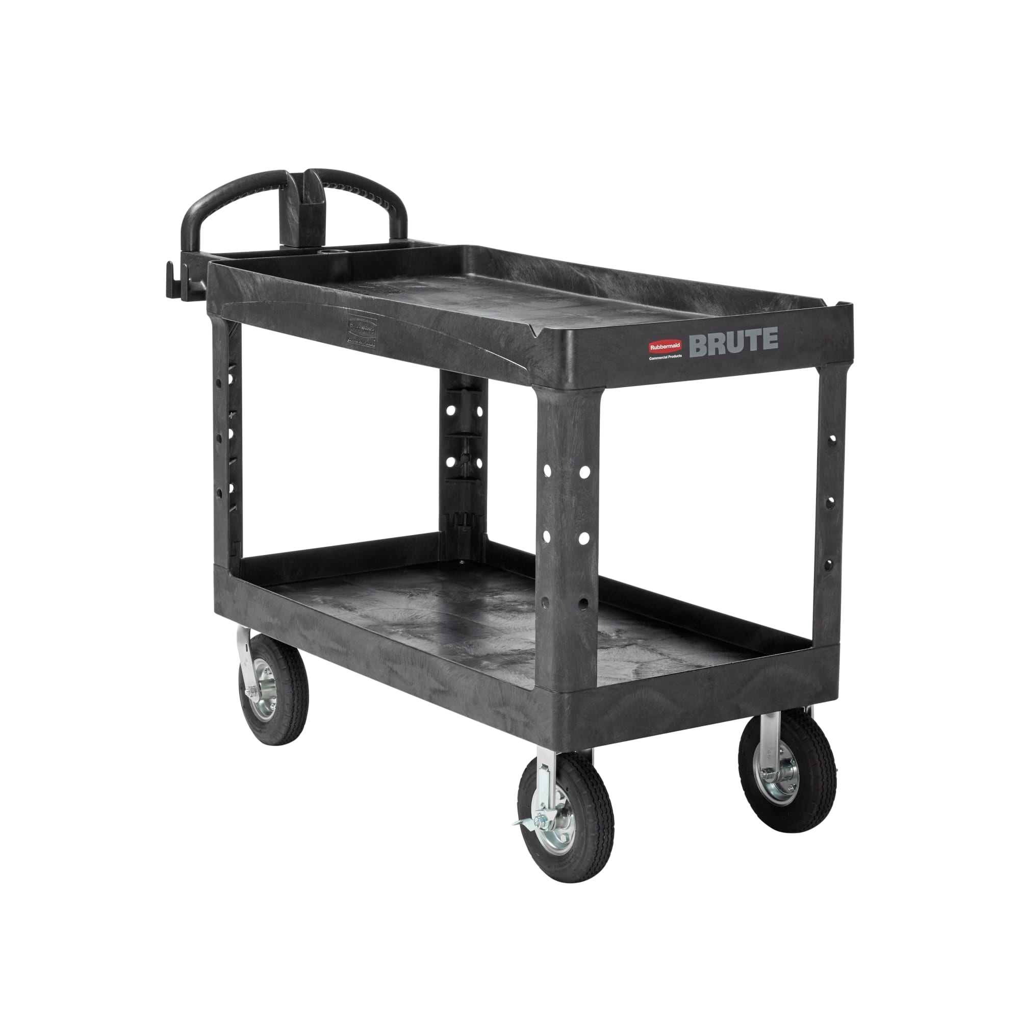 The BRUTE Heavy Duty Utility Cart with lipped shelves is a durable versatile cart that is ideal for transporting materials, supplies, and heavy loads up to 750 lbs. The lipped shelves prevent items from falling off the cart and features an integrated V-notch to hold pipe and conduit securely for safe cutting. Constructed of high-density structural foam that will not dent, chip, or peel and offers ergonomic handles for ideal hand placement. With handle compartments for additional storage, molded fittings for rolled supplies, an easy-access lipped bottom shelf, and a lipped top shelf, this is a versatile utility cart for any facility.