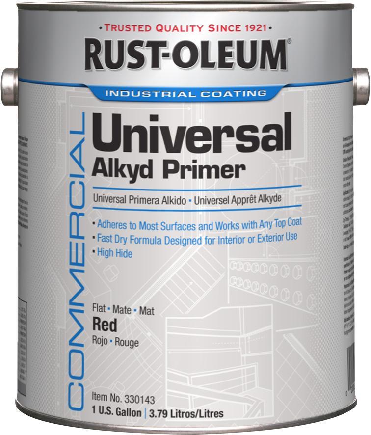 Rust-Oleum''s Commercial Universal Alkyd Primer is a high solids, oil-based primer designed for interior and exterior surfaces when optimal surface preparation is not possible. Our Universal Alkyd Primer is suitable for nearly all surfaces and provides excellent penetration, flexibility and stain blocking properties. It has excellent adhesion to dense, glossy surfaces such as enamel paints varnishes, paneling, laminates and ceramic tile without the need for sanding or de-glossing. It can be used as a DTM coating and has a fast drying time.
