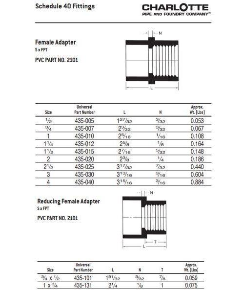 Charlotte PVC 02101 1200, 1-1/4 in nominal, Socket x FNPT end style, SCH 40/STD, PVC, Domestic