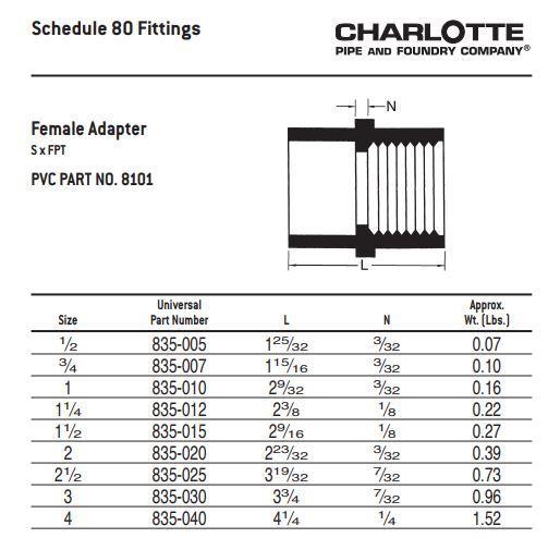 Charlotte PVC 08101 1000, 1/2 in nominal, Socket x FNPT end style, SCH 80, PVC, Domestic