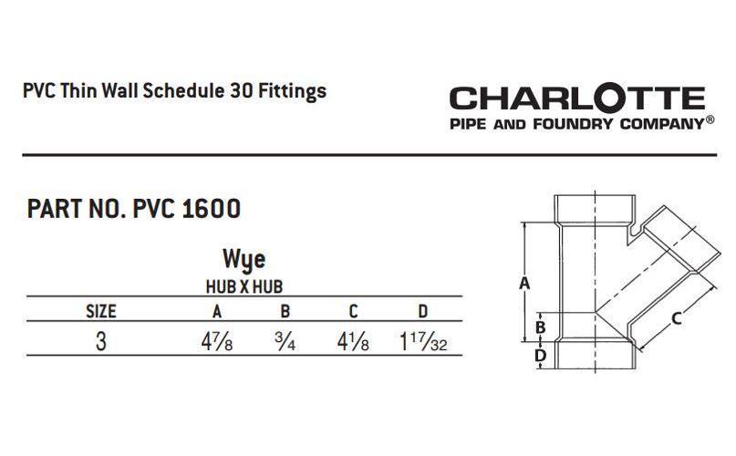 Charlotte PVC 01600 0600 Wye, Fitting/Connector: Wye, 3 in Nominal, Hub End Style, SCH 30, PVC, Domestic