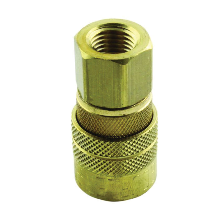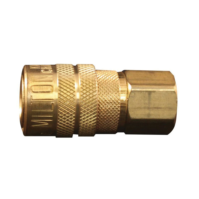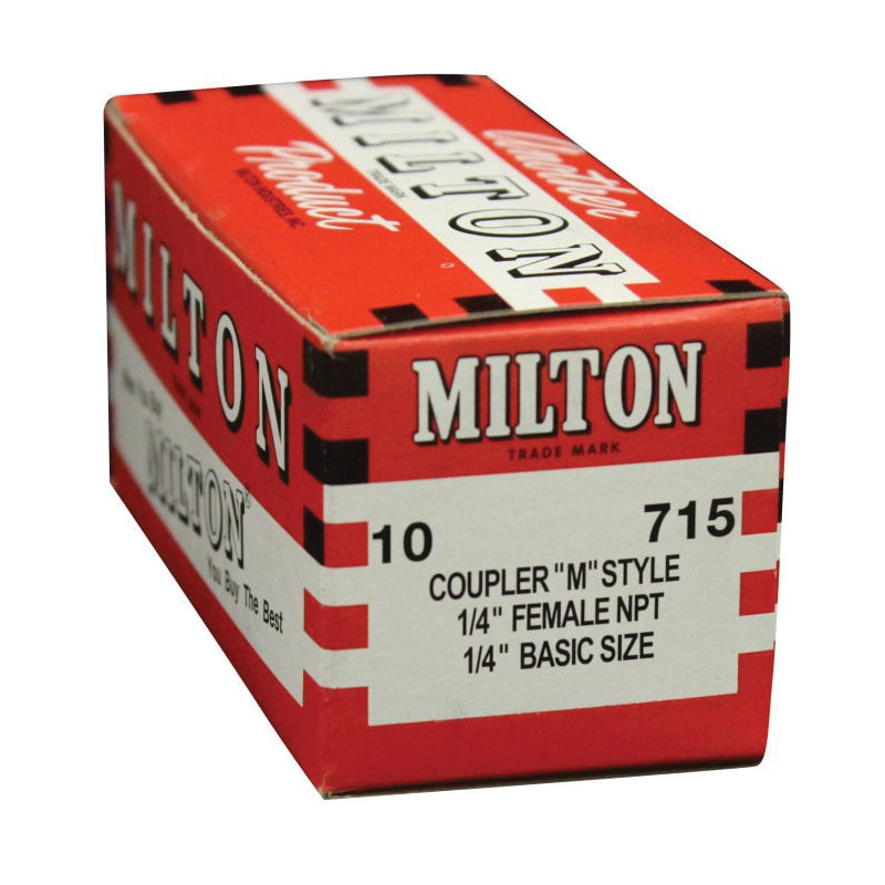 Milton® (715) 1/4 in FNPT M-Style® KWIK-CHANGE® Coupler. Milton Industries is proud to be the creator and leader of the pneumatic industry standard M-Style® Coupler. This 1/4 in FNPT M-Style® brass Coupler has a 1/4 in basic flow size, offering a maximum of 300 psi. Comes with Buna-N seal and air flow of 40 scfm. Milton® M-Style® KWIK-CHANGE® Couplers are made of brass, while M-Style® KWIK-CHANGE® plugs are made of case hardened steel and are plated to resist rust.