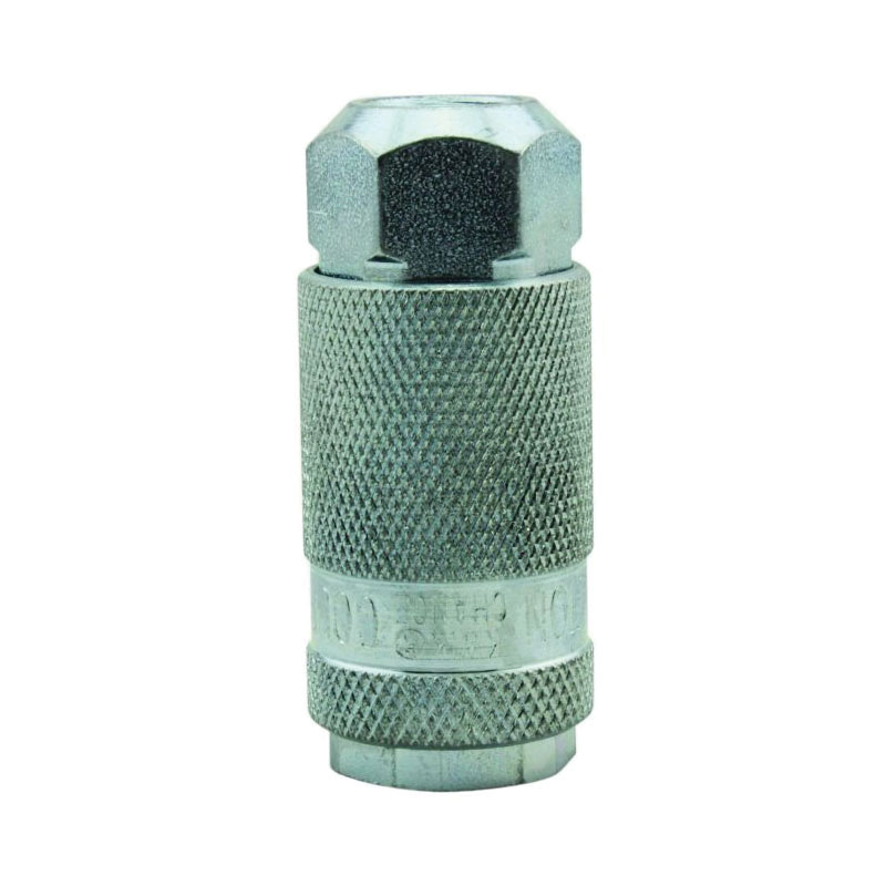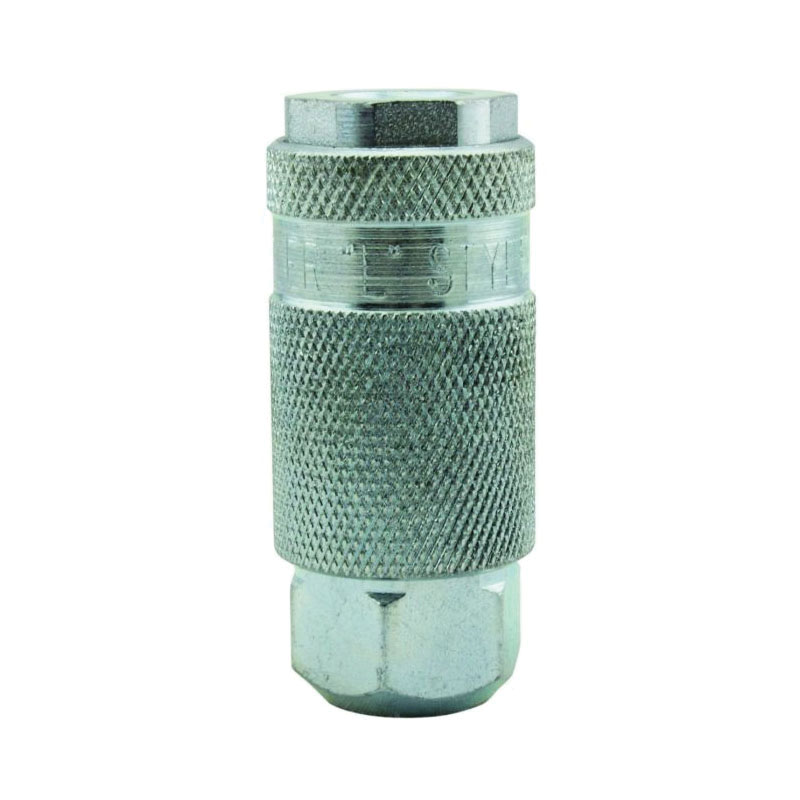 1/4 in FNPT L-style Coupler is steel plated to resist rust. L-style Couplers have a 1/4 in basic flow size and a maximum pressure of 300 psi. This push type Coupler has a maximum of 32 scfm and a Buna-N seal.