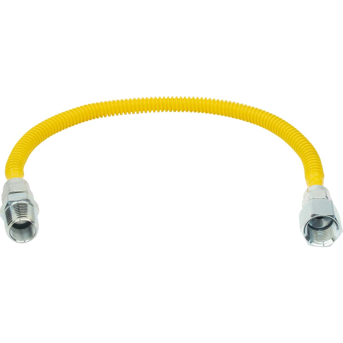 This 3/8 inch OD, 1/4 inch ID, durable, corrosion resistant stainless steel gas connector is configured with 1/2 inch MIP x 1/2 inch FIP adapters and is 24 inches in length. This CSA approved SafetyShield(R) gas connector features a premium antimicrobial coating to inhibit bacteria growth, improve corrosion and UV protection, and enhance flame and smoke resistance. The yellow coating is an industry recognized color for gas lines and provides extra corrosion protection from accidental contact with harmful chemicals that may be found in household products. It is commonly used for the installation of home appliances such as space heaters and wall heaters. Item comes in a bag.