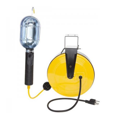 This Incandescent Work Light Reel is a Incandescent Work Light with a metal guard attached to Heavy Duty Metal Reel with 50-ft of retractable 18/3 SVT cord. The Work Light has an integrated metal hook with a rubber tip. Includes mounting brackets that allow it to be attached to the wall or ceiling. It uses a push button switch.