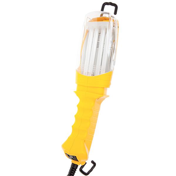 This Incandescent Work Light has a metal guard and an integrated metal hook with a rubber tip. The handle has an ergonomic shape making it easier to hold and handle. This unit also uses our exclusive 90 Degree Cord Swivel which keeps the cord up and out of the way making it possible to set the light down on its base for additional hands-free use. It uses a push button switch and has a 25-ft 18/3 SJT cord.