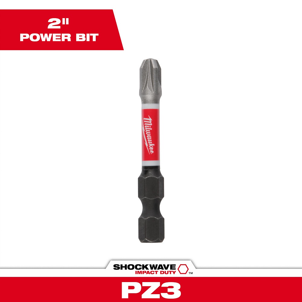 The MILWAUKEE® SHOCKWAVE™ Impact Duty 2" PZ3 Driver Bits provide the Ultimate Fit for a superior driving experience. The optimized SHOCKZONE™ shanks are customized per tip type to absorb peak torque and prevent breaking. The long-lasting Wear Guard™ Tip provides increased wear resistance, protecting the fit over the life of the bit. The customized tip geometry leads to less stripping of screws on the job site.