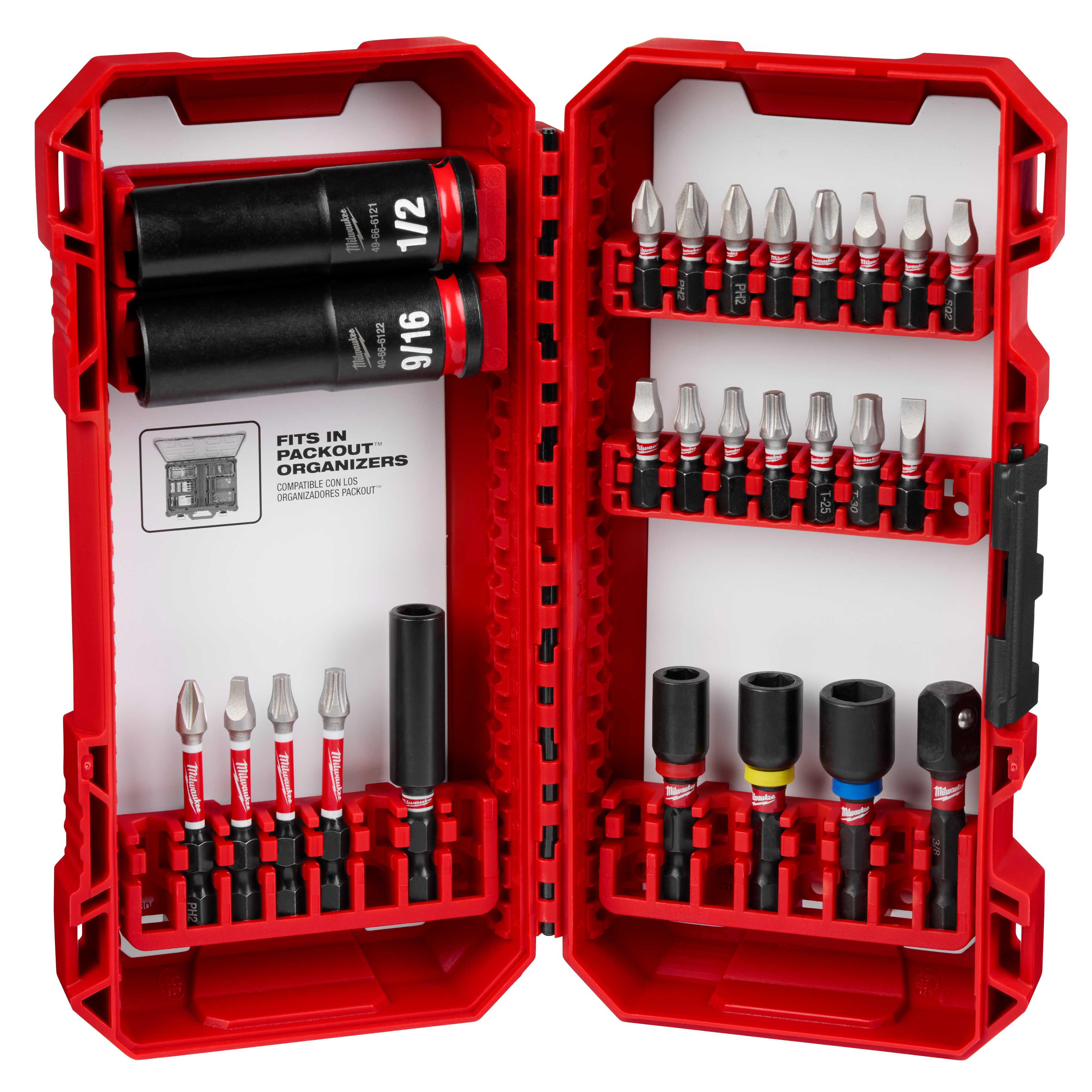 The MILWAUKEE® SHOCKWAVE™ Impact Duty 26PC Driver Bit Set provides the Ultimate Fit for a superior driving experience. The optimized SHOCKZONE™ shanks are customized for each tip type to absorb peak torque and prevent breakage. The long-lasting, Wear Guard™ Tip provides increased wear resistance, protecting the fit over the life of the bit. The customized tip geometry leads to less stripping of screws on the job site. The set is organized in a customizable accessory case designed to fit in PACKOUT™ Organizers.