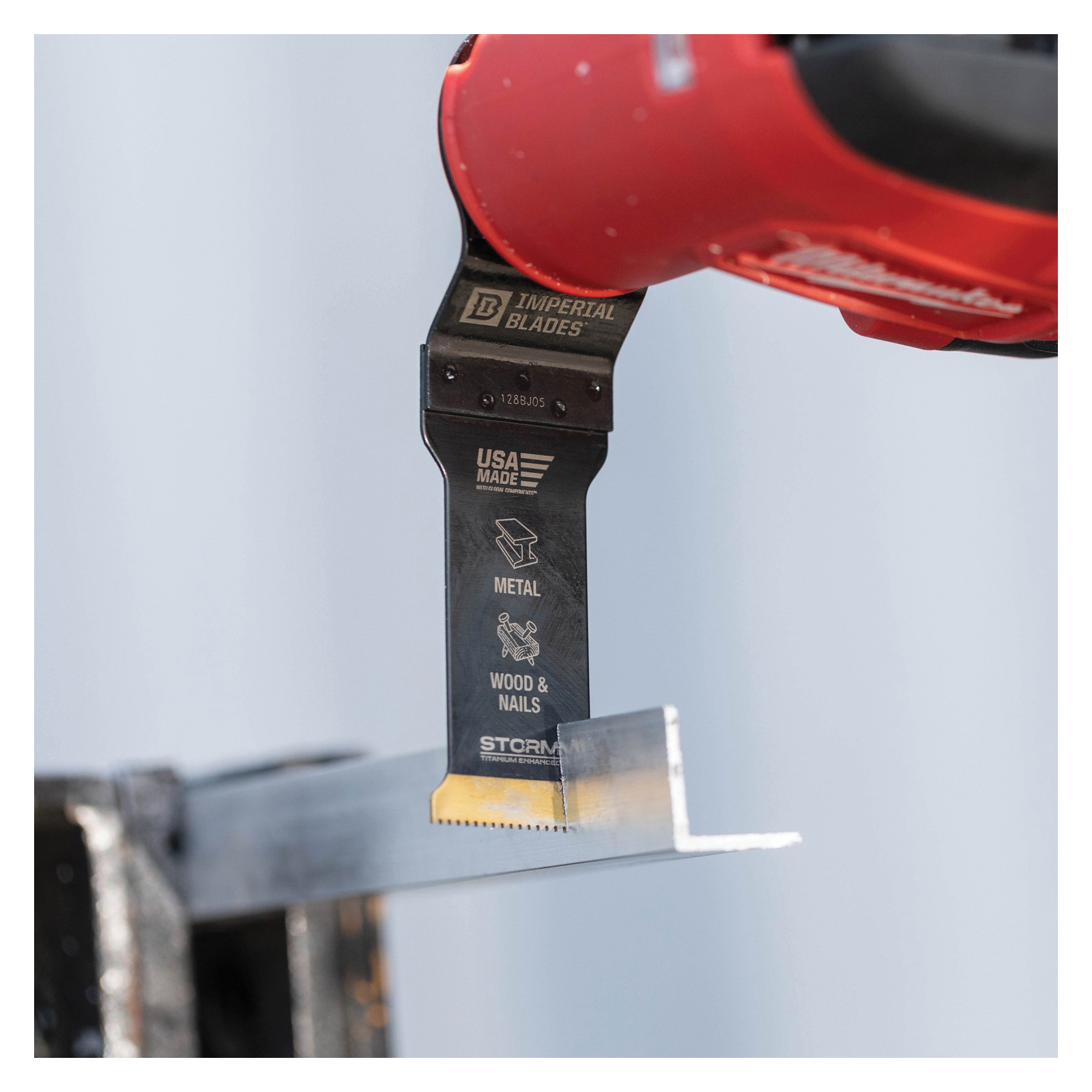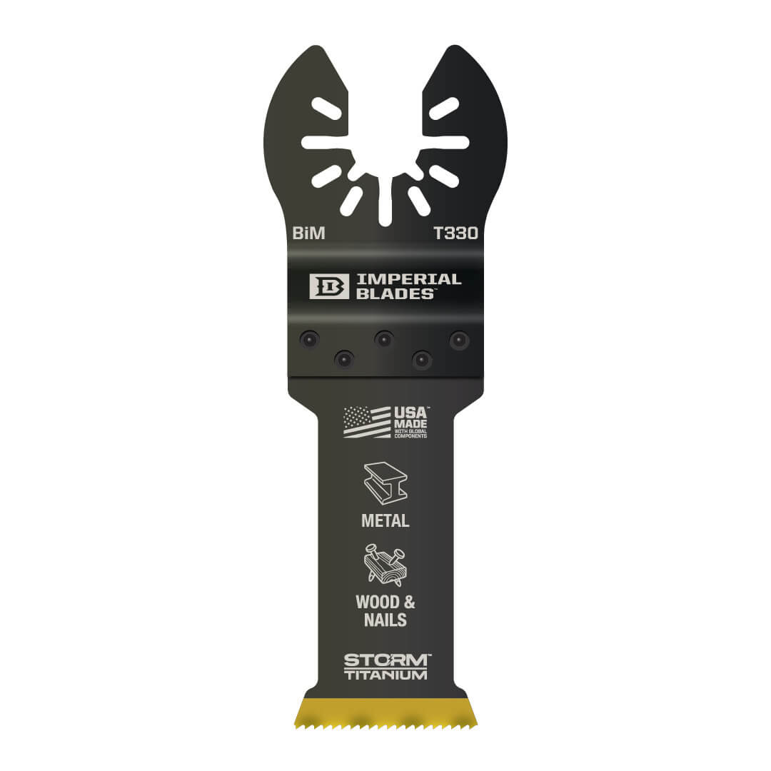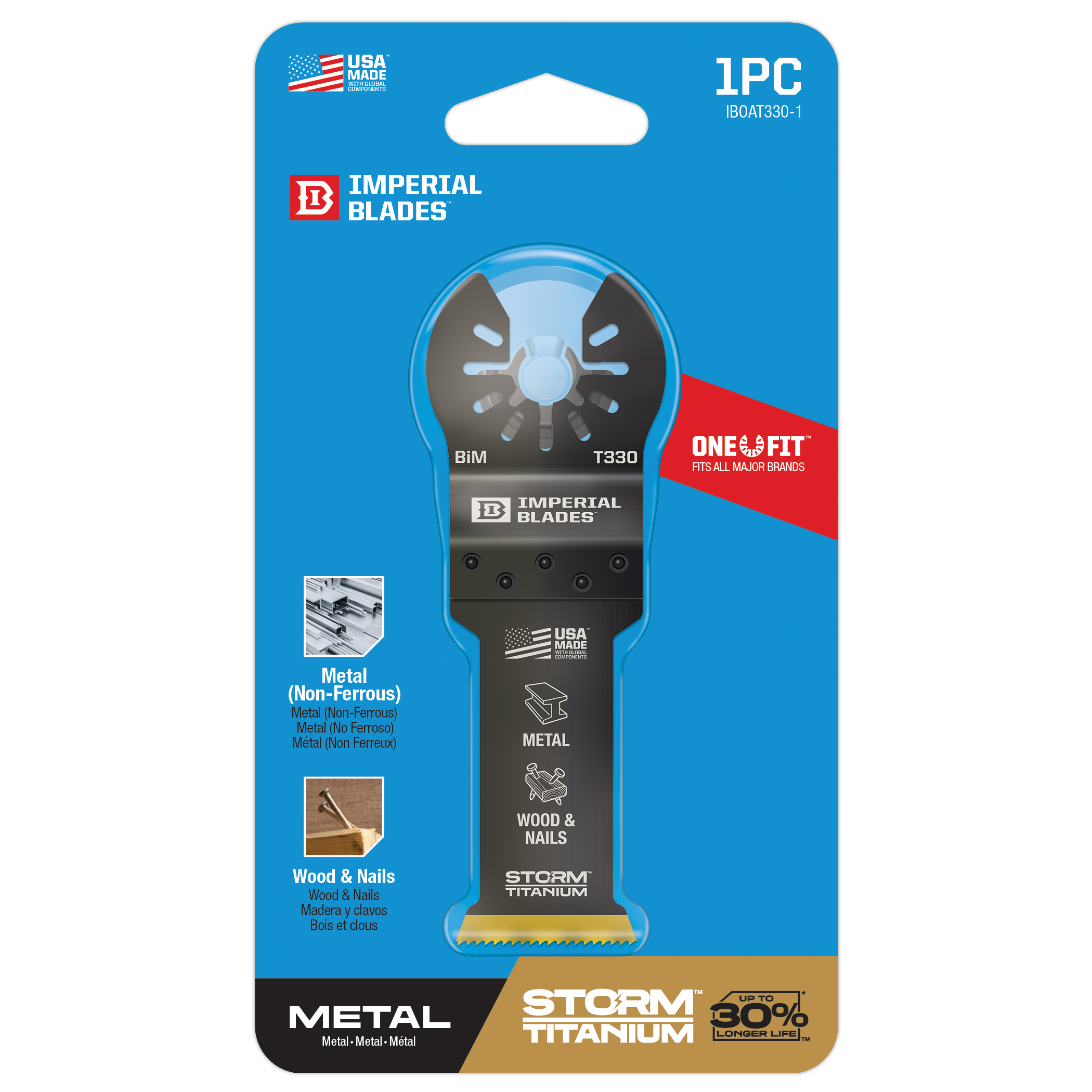 Imperial Blades One Fit™ 1-1/8" Storm Titanium Metal Blade is composed of durable bi-metal (BiM) and combined with Storm Titanium coating for extended life and performance. The wavy set tooth pattern makes this blade ideal for metal and multi-material applications by dispersing the wear on all teeth. Recommended applications are metal (Non-Ferrous), wood & nails, wood, PVC, drywall, and more. This oscillating titanium metal blade is ideal for deck maintenance, fence repair, flooring, framework with nails or staples, and plunge cutting vents and outlets. Our One Fit™ anchor fits all major brands of non-Starlock tools: Milwaukee, Ridgid, Ryobi, DeWalt, Dremel, Rockwell, Makita, Craftsman, Porter-Cable, SKIL, WORX, and more! Dremel models MM45 & MM50 require the included adapter.
